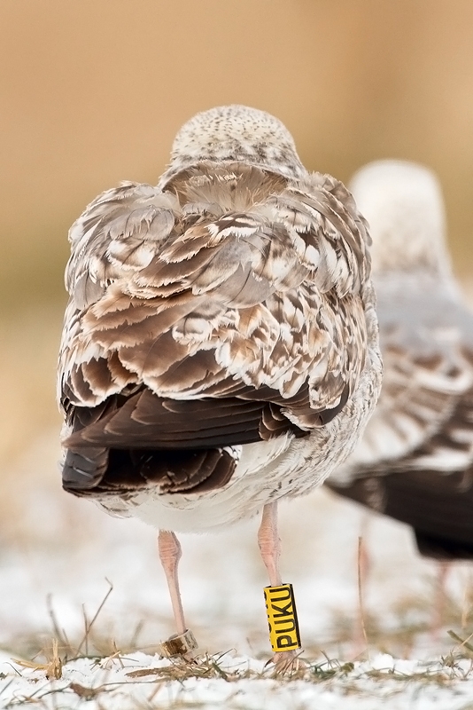 Larus cachinnans 1CY PUKU December 16 2010, Hely Naszály Ferencmajor Komárom-Esztergom, Hungary. Picture Gabor Papp. Yellow PUKU and metal UKK L-009555, ringed as pullus on June 05 2010, at Cherkasy Kreminchuk reservoir, Ukraine (49,4 32,15). Many coverts, but no tertials replaced. |