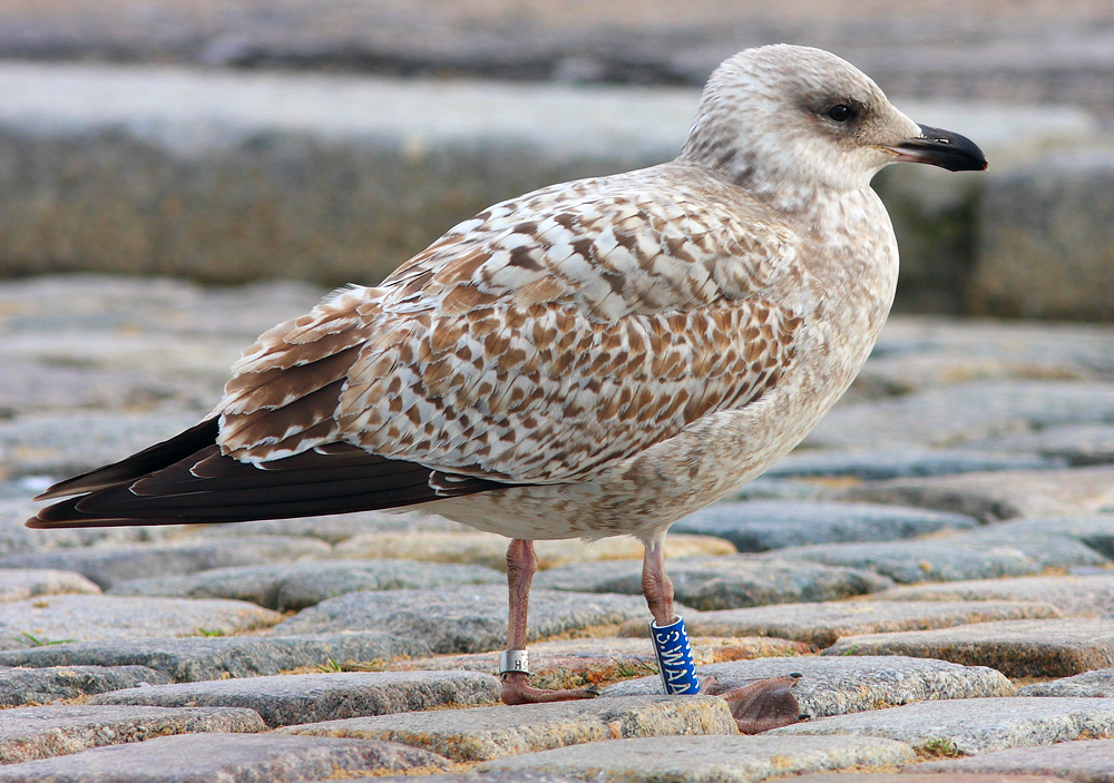 Larus argentatus argenteus 1cy S.WAA 11 December 11 2011, Boulogne-sur-Mer, NW France. Picture: Jean-Michel Sauvage. Ringing data: SWAA, ringed as pullus at Zeebrugge, Belgium on 15 July 2011. See also SWAA. Note the strongly marked scapulars and heavily notched greater coverts, as well as the compact jizz. |