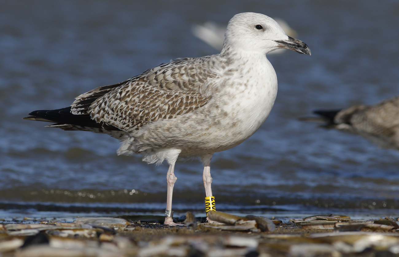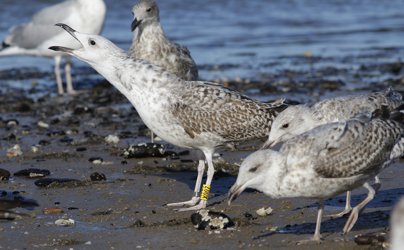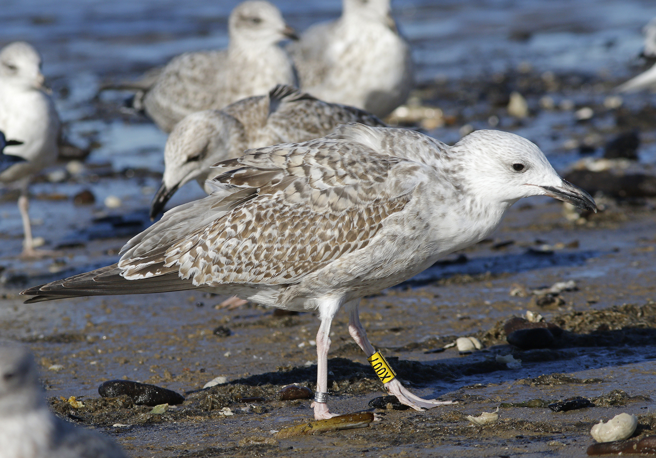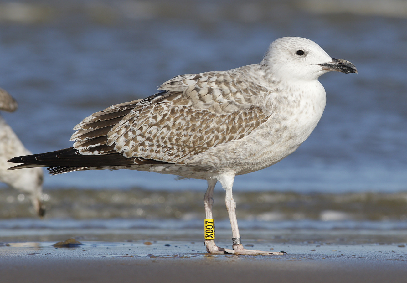 Larus cachinnans hybrid X007 1CY, October 05 2016, Katwijk, the Netherlands. Picture: Mars Muusse. Yellow X007 and metal DEH Hiddensee EA-202407 ringed as pullus on June 07 2016 in a mixed colony of Laußig, eastern Duitsland (51,34N 12,38E). Male. Earlier recoveries: Probably both argentatus (for sure) and cachinnans involved.