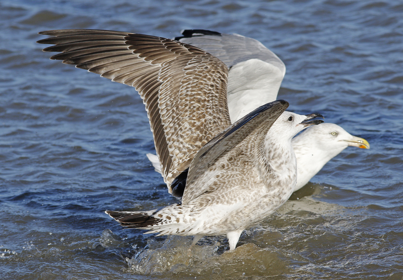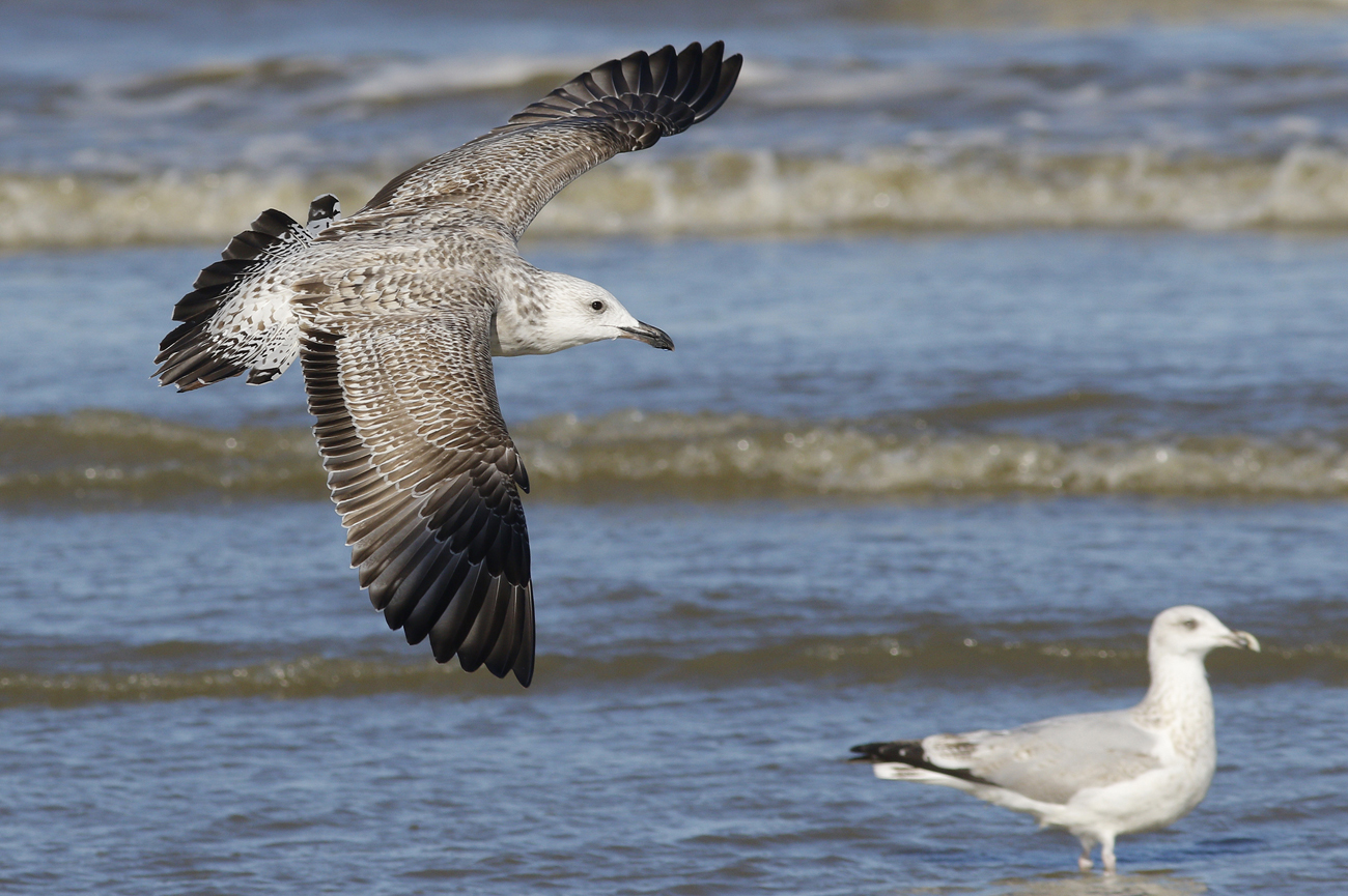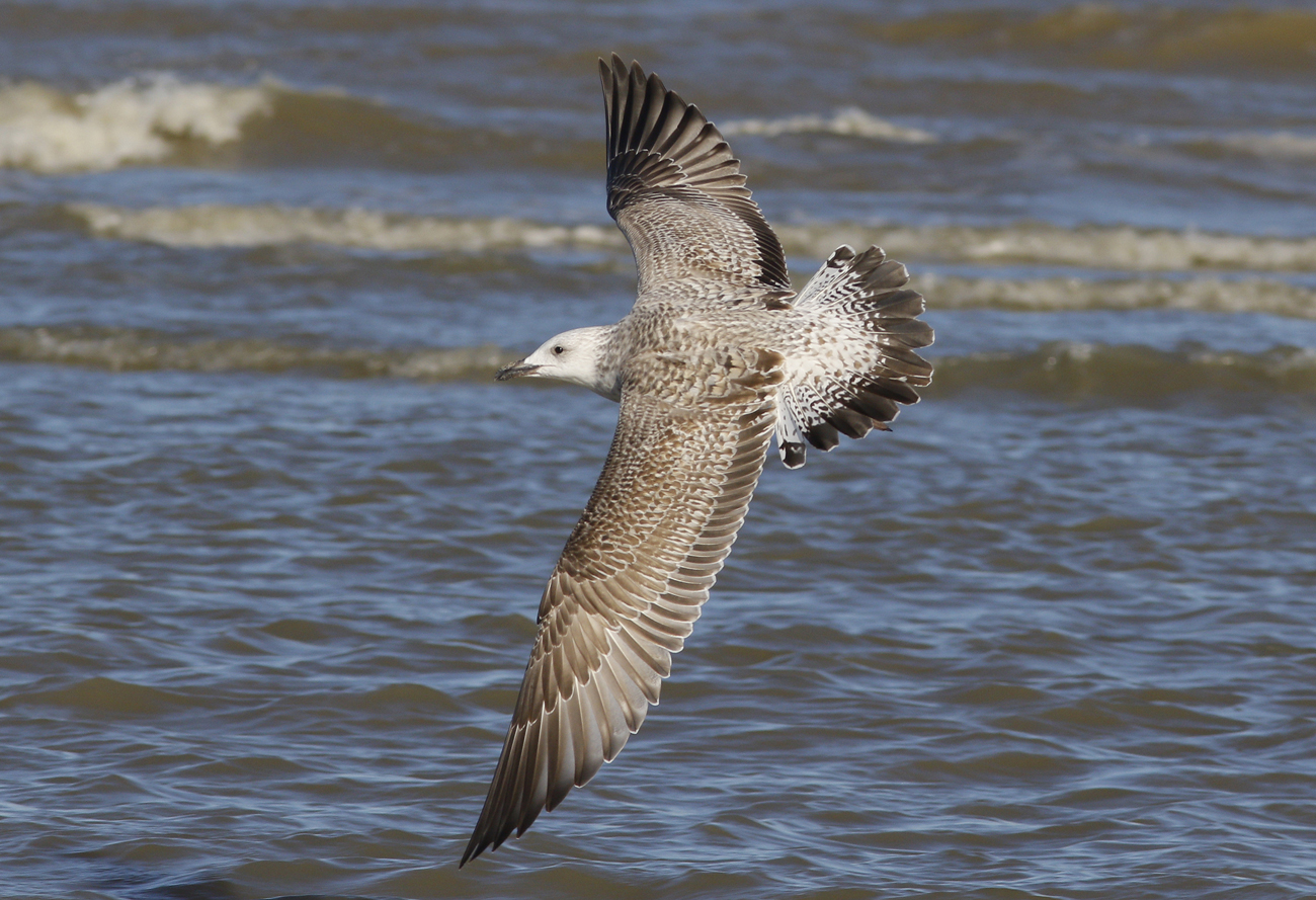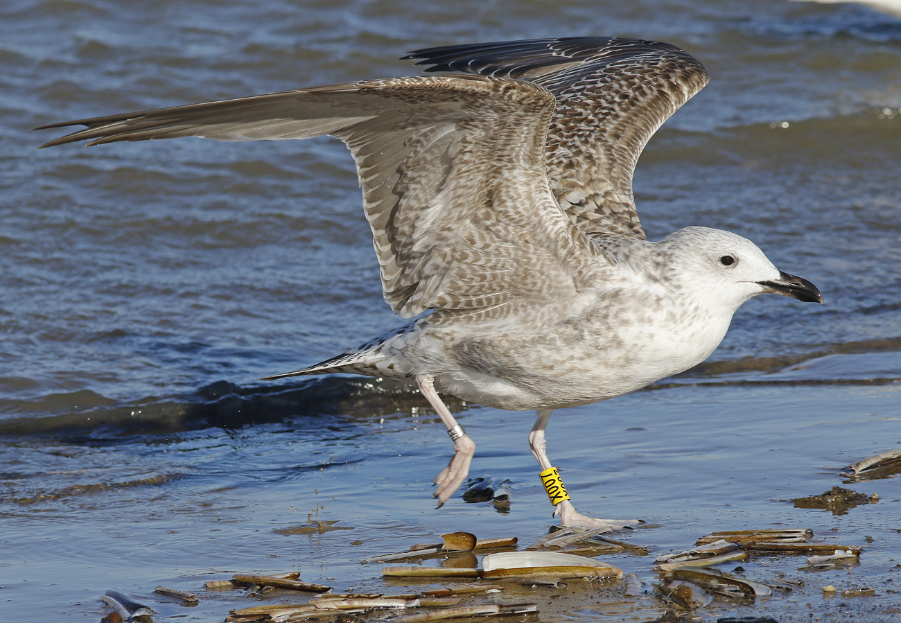 Larus cachinnans hybrid X007 1CY, October 05 2016, Katwijk, the Netherlands. Picture: Mars Muusse. Yellow X007 and metal DEH Hiddensee EA-202407 ringed as pullus on June 07 2016 in a mixed colony of Laußig, eastern Duitsland (51,34N 12,38E). Male. Earlier recoveries: Probably both argentatus (for sure) and cachinnans involved.