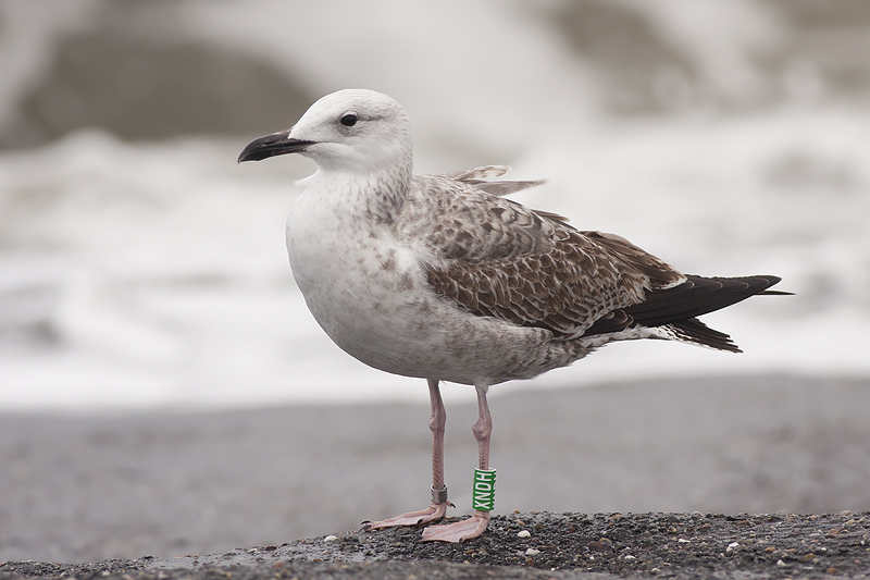 Larus cachinnans 1CY XNDH November 05 2013, Westkapelle, the Netherlands. Picture: Corstiaan Beeke. Bird ringed green XNDH, probably ringed as pullus in 2013 in Sachsen, Germany. Classic bird. No coverts or tertials replaced. |