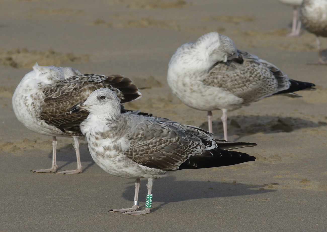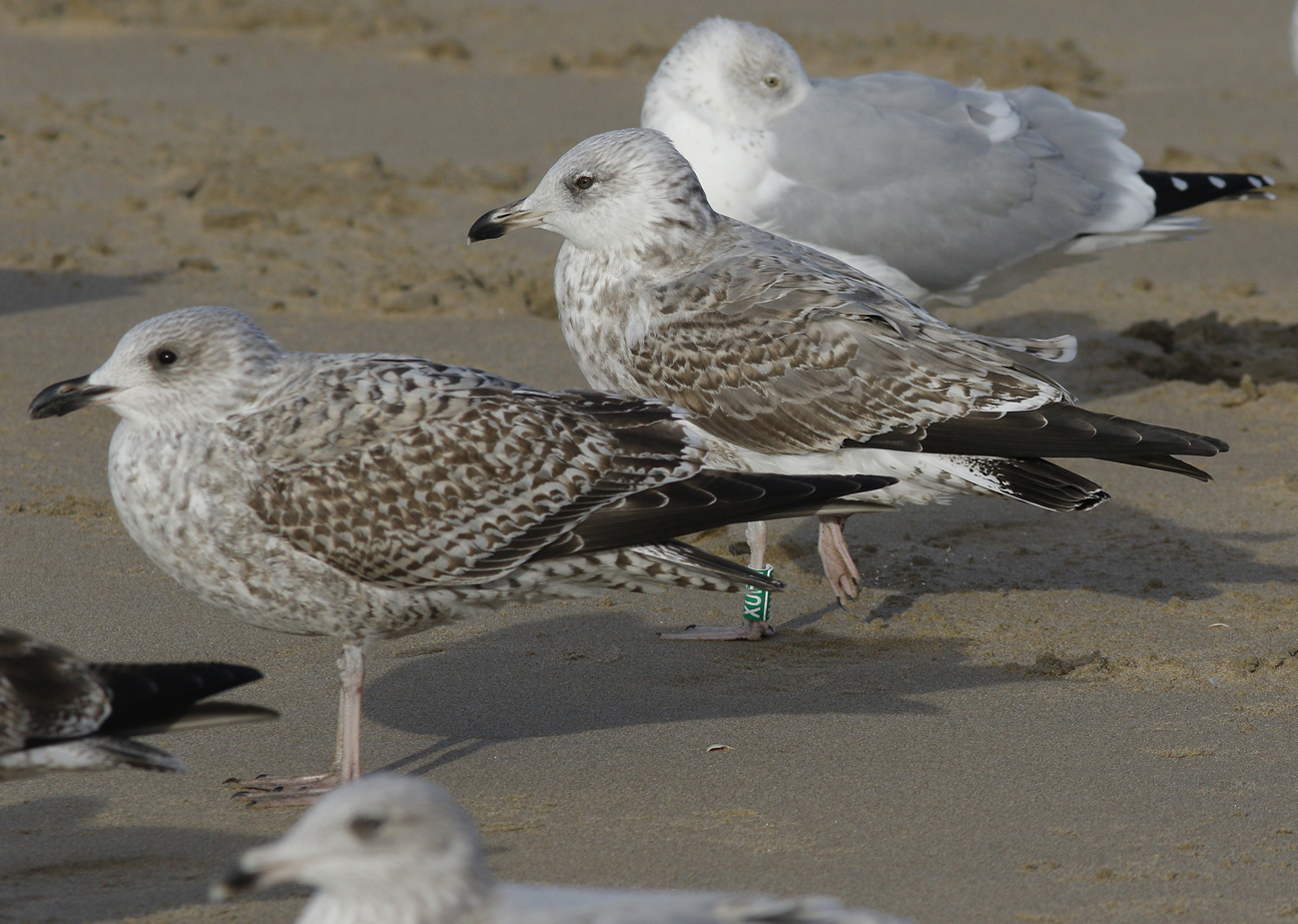 Larus cachinnans hybrid XUFH 2CY, November 16 2016, Katwijk, the Netherlands. Steppenmöwe Larus cachinnans plastic green XUFH. Ringed as pullus on June 09 2015 at Gräbendorfer See, Sachsen, Germany. Recoveries: Probably some argentatus involved, but michahellis equally likely. We'll wait till it grows older over the years...