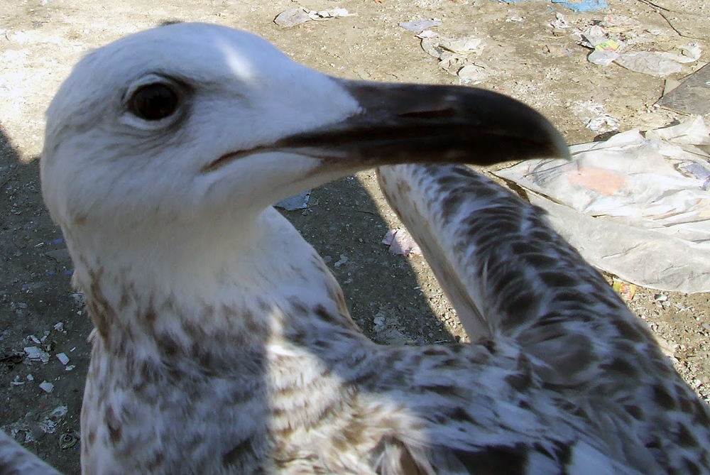 Comparison: orange 040H, 1st winter michahellis, same location, same date. Note large amount of replaced inner wing-coverts, which indicate michahellis & cachinnans, then note streaked head and breast, dark outerweb of inner primaries, patterned underwing, chocolate brown wash rather then greyish brown tone (greyish brown more typical for cachinnans) and bold markings on 2nd gen coverts and scapulars all indicating michahellis.