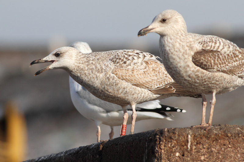 This bird, red 09P3, is very Herring-like and has a score of 25 (rough estimations). Limited moult, transversal bars on scaps, even on very fresh lower scapulars, streaked head and mottled underparts, head shape with obvious gonys all indications for michahellis or argentatus influences.