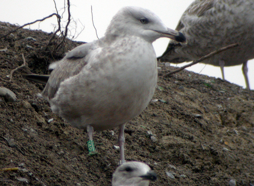 Larus cachinnans hybrid? 2CY 14P2 December 13 2007, Łubna landfill, Poland. Picture: Ruud Altenburg. Green ring from Poland. Data pending, probably ringed as pullus green 14P2 on May 20 2006 in the mixed colony of Wisla reservoir - Wloclawek, Poland (52°39'N, 19°08'E). No details on parentage. This bird is probable hybrid Caspian Gull L cachinnans x Herring Gull L argentatus, and very Herring-like with its pale iris in 2W plumage and no mirror on P10. Parallel bill with weak gonys angle more like cachinnans. |