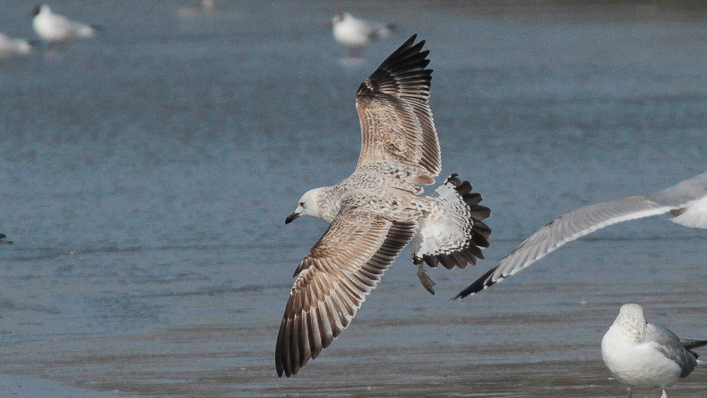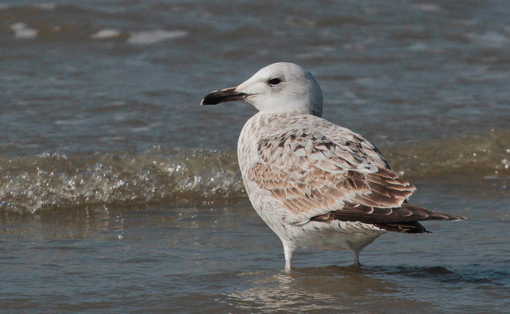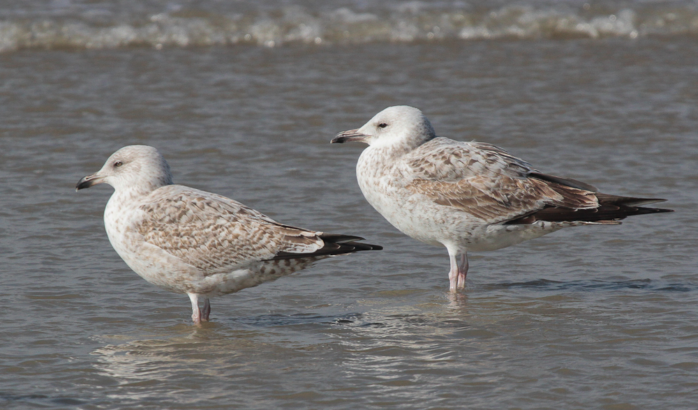 Larus cachinnans 2CY, March 18 2013, IJmuiden, the Netherlands. Picture: Lars Buckx. Only single inner lower covert and no tertials replaced in post-juvenile moult. With adult Caspian Gull. below: with 3CY Herring Gull. |