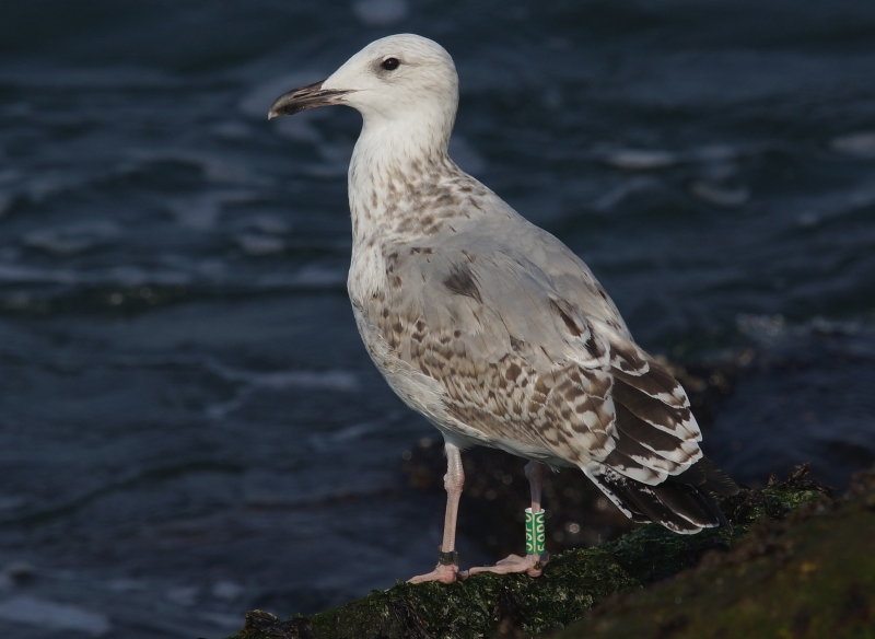 Larus cachinnans 59P0 2CY, August 14 2012, IJmuiden, the Netherlands. Picture: Roy Slaterus. Green 59P0 and metal Gdansk DN 20684, ringed as pullus on May 14 2011 at Turek, Poland (52°00'N; 18°39'E). Complete moult: P7 fully grown, no old juvenile primaries left. |
