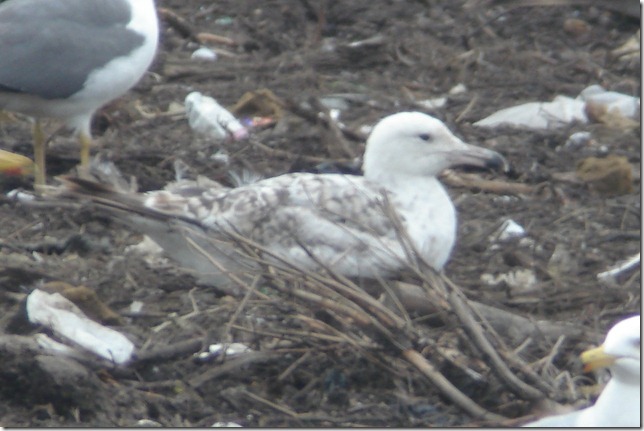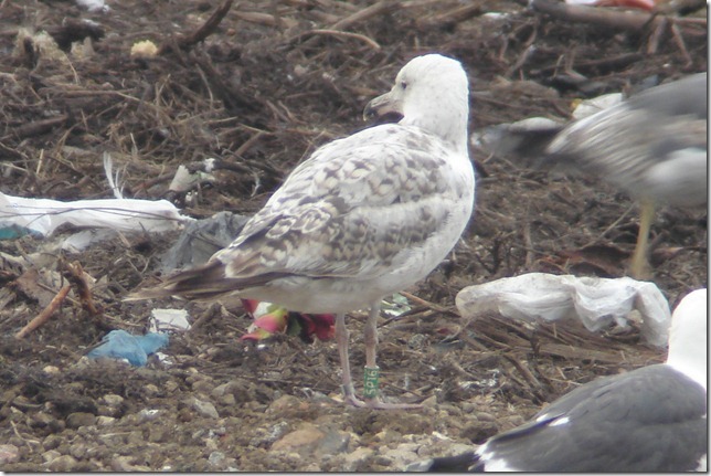 Larus cachinnans hybrid? 2CY 5P16 June 15 2006, Gloucester landfill site, UK. Picture: John Sanders. Green 5P16 and metal DN16021. Bird ringed as pullus on May 27 2005 at Jankowice Babice Malopolskie, Poland. Maybe one of the parents is argentatus, but birds in complete moult are always difficult. New tertials and coverts with barred pattern.