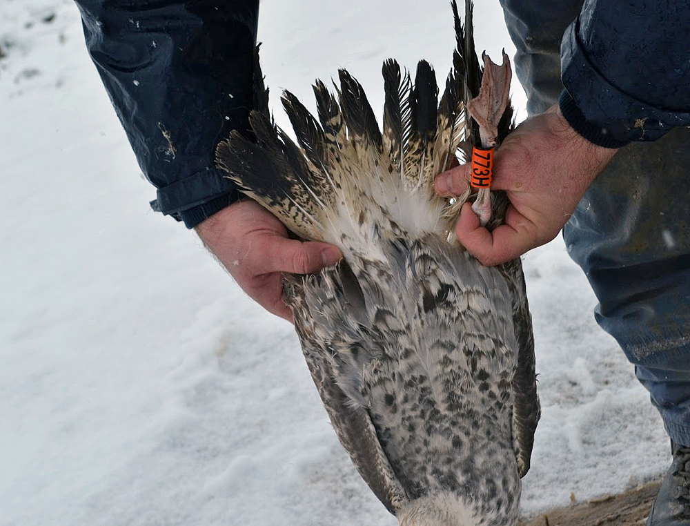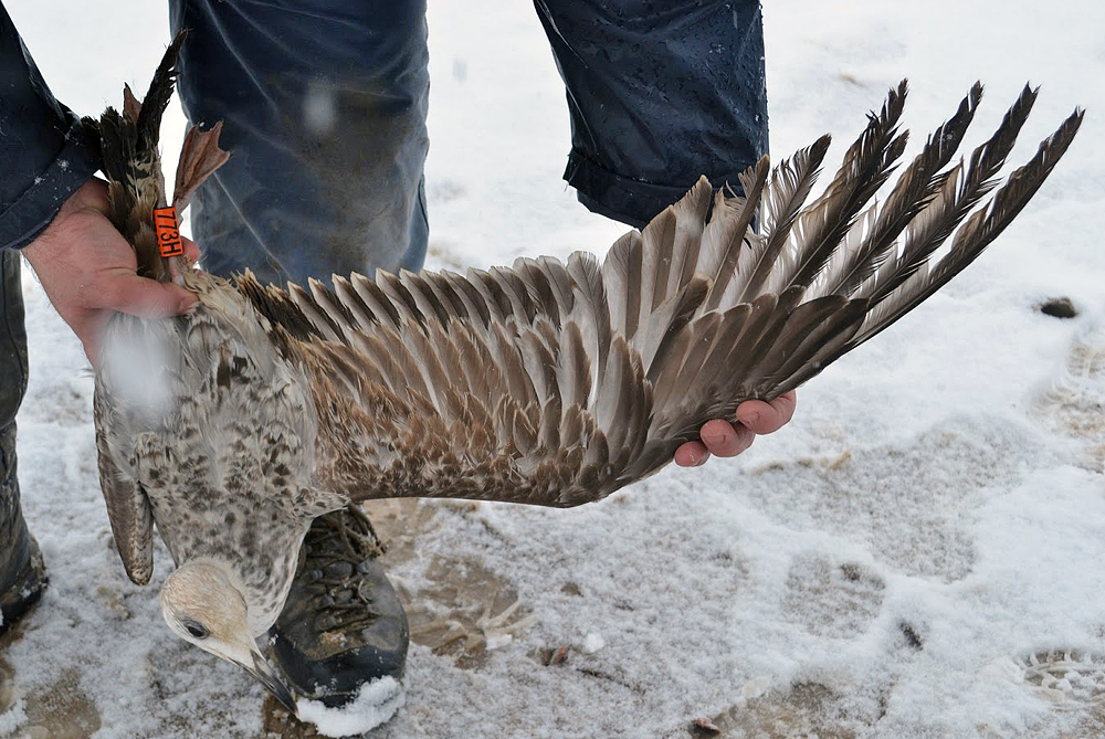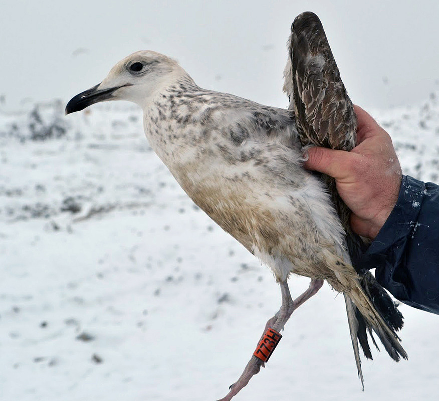 Larus cachinnans 2CY 773H January 13 2013, Jakuševec-Zagreb, Croatia. Picture: ringing team Luka Jurinovic. Orange 773H, ringed at Zagreb landfill. Exact colours difficult due to muddy condition this ringing date. Classic bird, with pale head and pale underparts. Pale brown-grey tone to plumage, Venetian blind effect on inner primaries and apical spots on inner primaries, simple pattern on (inner) greater coverts, broad tail-band of evenly width towards outer rectrices and multiple subterminal bands on outerweb of R6.