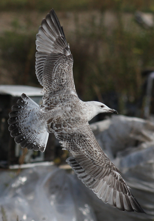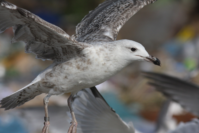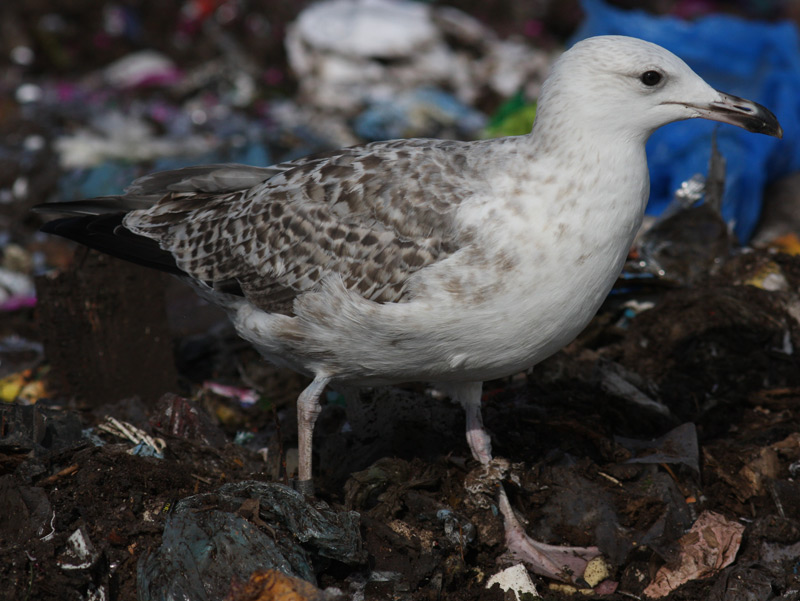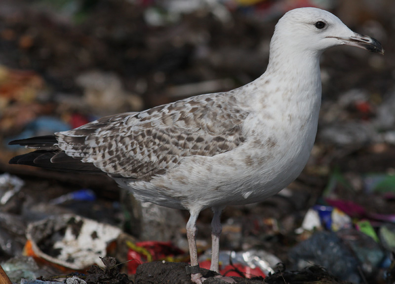 Larus cachinnans hybrid? 2cy LIK EN03021 September 08 2009, Klaipeda dump, Lithuania. Picture: Visa Rauste. Metal ring Kaunas - Lithuania. Showing characters of both Herring and Caspian Gull. Bird in complete moult: P8 fully grown.