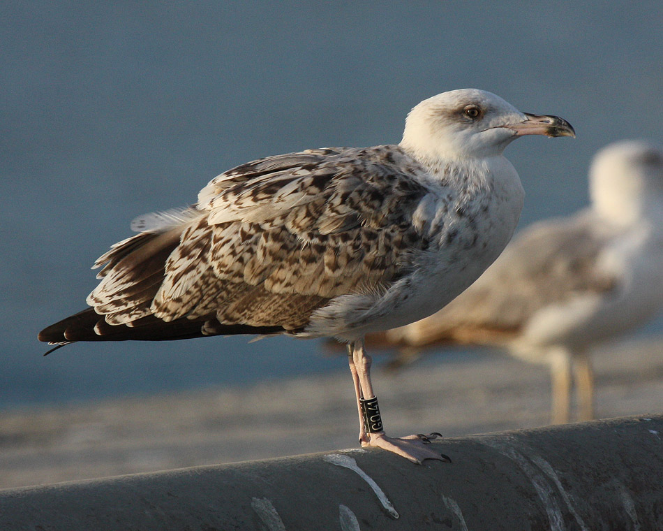 Larus michahellis 2cy G0.41 August 2010, Málaga, Spain. Picture: Gabriel Martín. Ringing data: black G0.41, ringed as pullus in summer 2009, in the urban colony of Málaga, on a roof very close to the harbour. Probably male. See: G0.41. Last stage of complete moult: P7 fully grown, no old juvenile primaries left. The plumage is quite