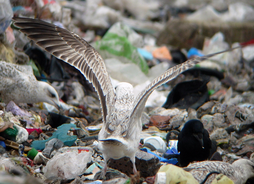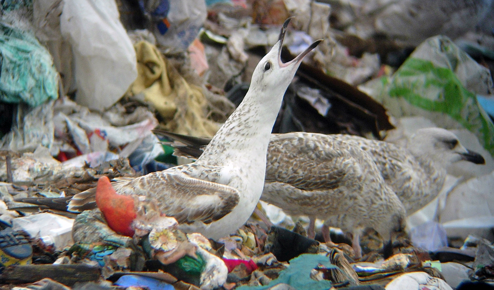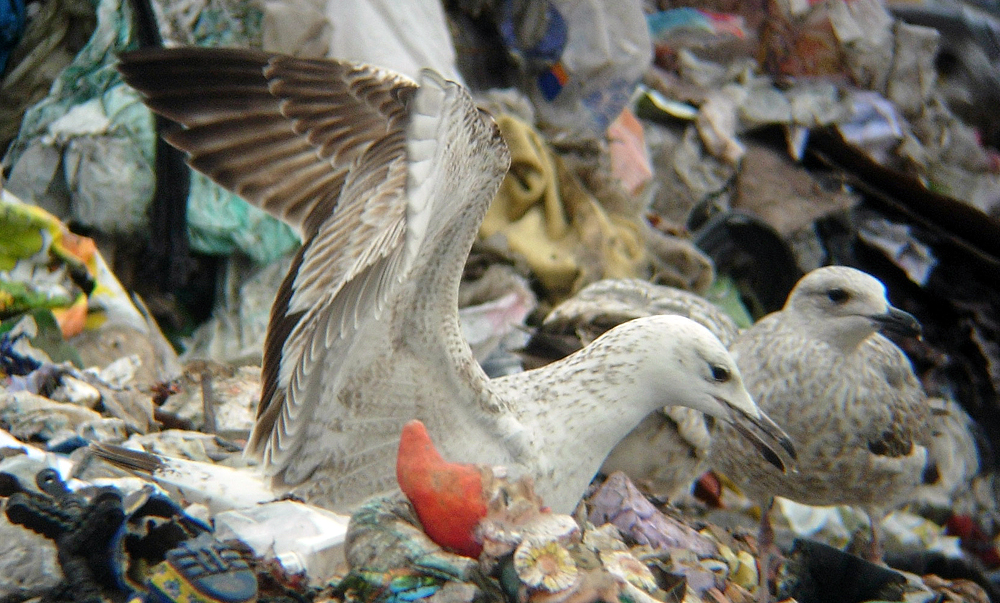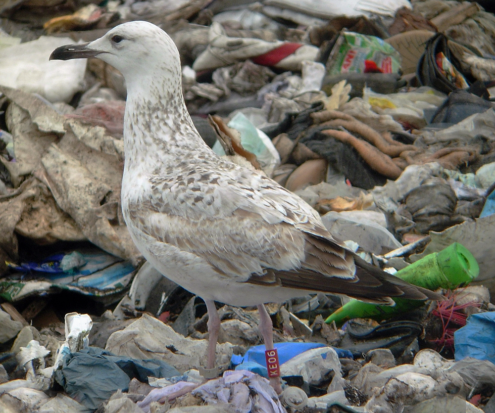 Larus cachinnans 2CY KE06 April 27 2006, Deponie Pohlsche Heide - Minden, Germany (52°23'05N, 08°46'45E). Picture: Armin Deutsch. Red KE06 and metal BYM DA ring, probably ringed as pullus in May/June 2005 at Gatovo - Minsk district, Belarus, (53.47'00''N, 027.40'00''E). This is a mixed rooftop breeding colony in Minsk, with breeding cachinnans, argentatus and fuscus. All scaps replaced, coverts and tertials still juvenile.