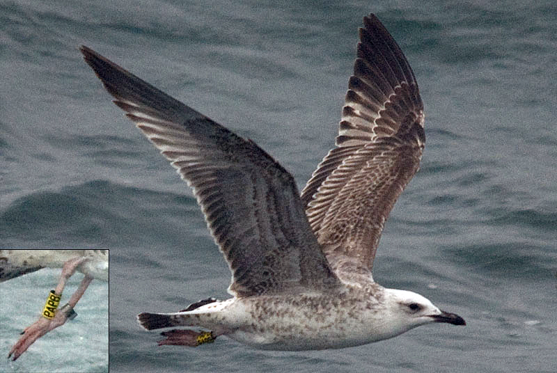 Larus cachinnans PAPB 1CY, 3CY & 8CY, October 2009, January 2011 & February 2016, the Netherlands & Great Britain. Yellow PAPB and metal PLG DN-26282; ringed as pullus on May 21 2009, at Jankowice Babice Malopolskie Poland (50,03333 19,46667). Bird crossing the North Sea, recorded again on December 24 2009 by NTGG in Great Britain, Rainham marshes London. Subsequently, recorded as 3CY bird at Dartford (January 03 2011) and Pitsea landfill Essex (November 26 2011). below: cachinnans PAPB 1CY, October 30 2009, North Sea, the Netherlands. Picture: Maarten van Kleinwee. Following vessels, together with Herring Gulls.