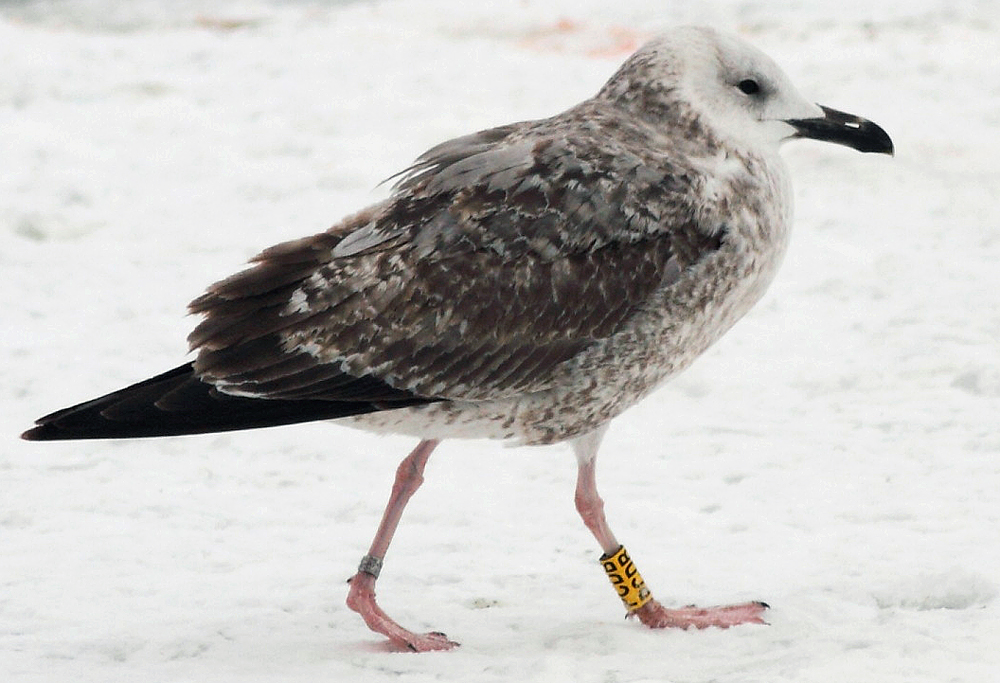 Larus cachinnans 2CY PCDB February 17 2012, Herastrau park Bucharest, Romania. Picture: J. Avery. Yellow PCDB; ringed as pullus in 2011 in Poland (data pending). Dark bird, Several scaps still juvenile, and no moult in coverts or tertials. |