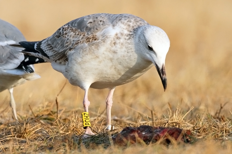 Larus cachinnans 2CY PDHZ December 10 2011, Hely Naszály Ferencmajor Komárom-Esztergom, Hungary. Picture Gabor Papp. Yellow PDHZ and metal PLG DN-18613, ringed as pullus on May 27 2010, at Kozielno Paczkow Opolskie Poland (50,48333 16,96667). Not all coverts visible from this angle, but already clear many MC and LLC and several LC have been replaced. |