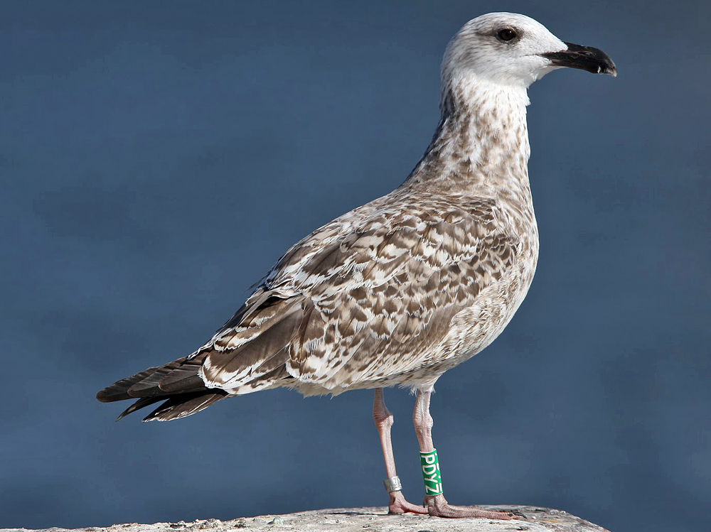 Larus michahellis 2cy PDYZ August 15 2009, Tarragona, Spain. Picture Chris Gibbins. Ringing data: green PDYZ ringed as pullus in 2008, Ebro Delta, Spain. Last stage of complete moult: P8 fully grown, no old juvenile primaries left. First-summer michahellis show bewildering variability. This bird is a rather typical example of the more heavily marked type. |