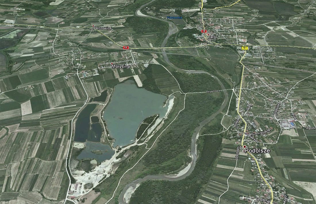 Larus cachinnans 2CY PEEE January & February 2012, Osthafen - Minden & Vlotho Herfold Detmold, Germany. Picture: Eckhard Moeller & Armin Deutsch. Yellow PEEE and metal PLG DN-18857; ringed as pullus on May 10 2011 at Zwirownia Palczowice, Malopolskie, Poland (50,00001 19,450001). Zwirownia = gravel pit, this colony is situated between the towns of Zator and Palczowice in a gravel pit, about 10 km's south of Jankowice. Picture below: from the air looking south over gravel pits along river Skawa. River Skawa (Schaue) is a river in southern Poland, a right tributary of the main river Vistula. It originates in the Western Carpathians, is 96 km long and drains 1,160 km².