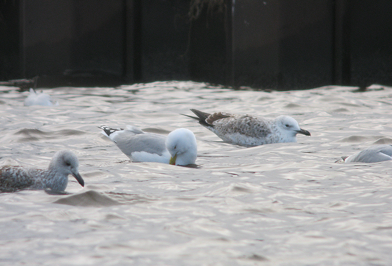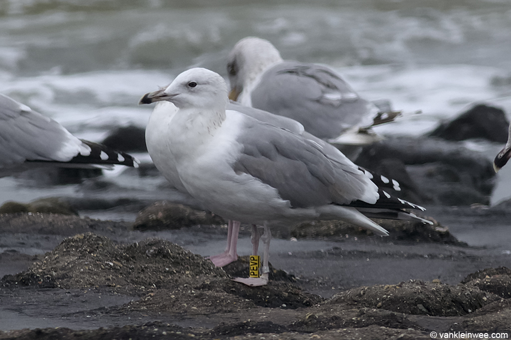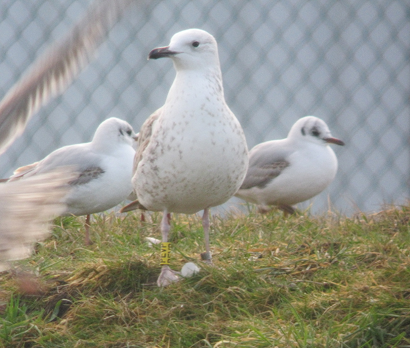 Larus cachinnans 2CY-3CY PEVP February 2012 & October 2013, the Netherlands. Picture: Willem-Jan Fontijn & Maarten van Kleinwee. Yellow PEVP and metal PLG DN-27086; ringed as pullus on May 24 2011 at Jankowice Babice Malopolskie, Poland (50,03 19,47). below: cachinnans 2CY PEVP February 19 2012, Groningen, the Netherlands. Picture: Willem-Jan Fontijn. Classic 1W bird, with replaced upper tertials and many inner coverts. White-headed bird with obvious neck boa. below: cachinnans 3CY PEVP October 18 2013, Westkapelle, the Netherlands. Picture: Maarten van Kleinwee. Very mature bird, as older 4CY bird in plumage. Large mirror on P9 and P10.