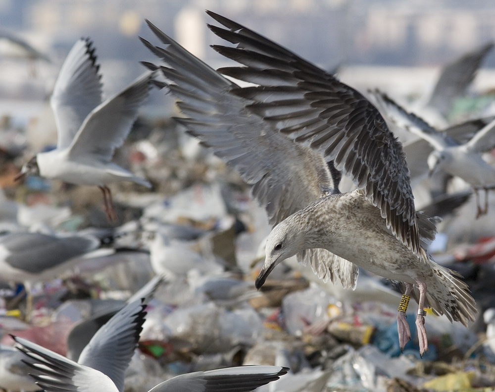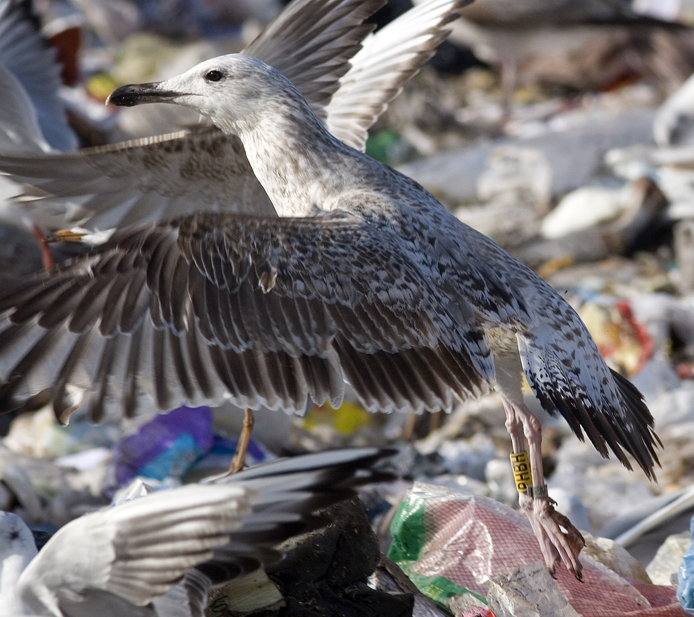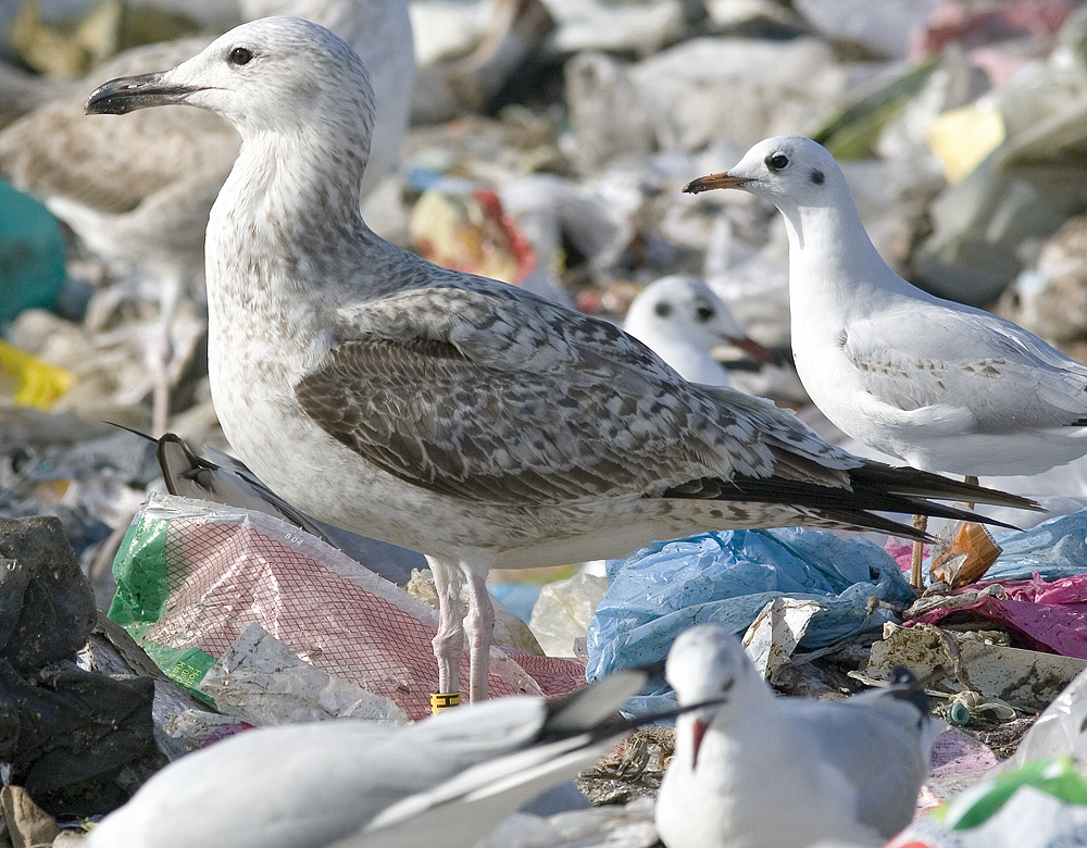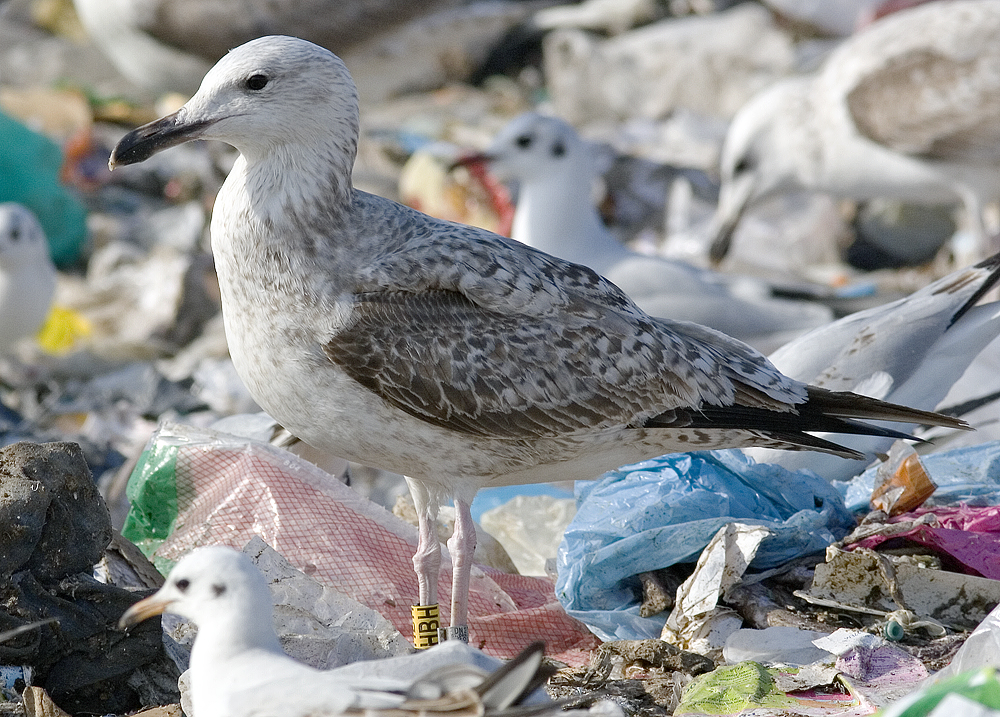 Larus cachinnans 2cy PHBH 19 February 2012, Zagreb, Croatia. Picture: Mars Muusse. Bird ringed yellow PHBH & metal PLG DN-27158, ringed as pullus on May 24 2011 at Jankowice Babice Malopolskie Poland (50,03333 19,46667). Post-juvenile moult included upper tertials, inner GC, inner & central MC, inner & central LLC, and several of the inner LC. |