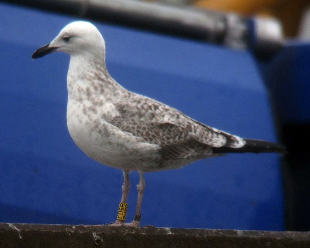 Larus cachinnans 2CY PHEB December 13 2012, Oss, the Netherlands. Picture: Lützen Portengen. Yellow PHEB and metal PLG DN-27203; ringed as pullus on May 24 2011 at Jankowice Babice Malopolskie, Poland (50,03 19,47). Interesting 2W bird, with dark bill, and no grey scapulars. |