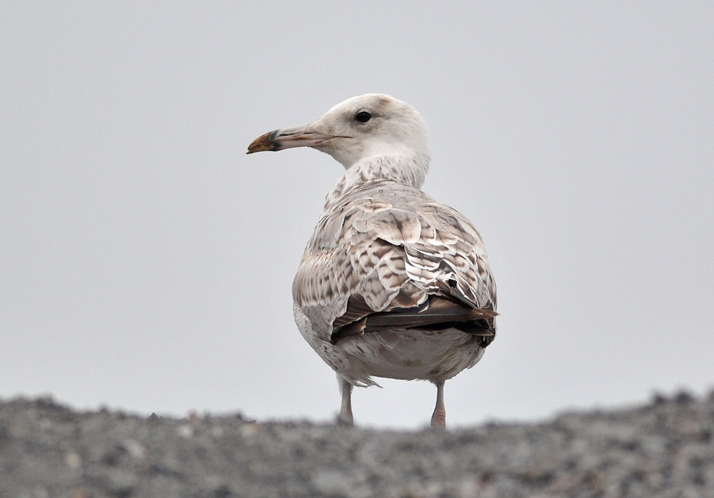 In this area are mixed breeding colonies (near Katowice), with far most birds breeding here are cachinnans, but in this area also records of very few michahellis from the south (e.g. ringed female from Italy) and argentatus from eastern Germany are possible (see PDF). PHNP is cachinnans. Bird in complete moult. All MC replaced, inner GC replaced and moult wave progressing outwards. Outer GC replaced and moult wave going inwards, still a gap there, but all old juvenile GC dropped. Last old juvenile coverts still present in carpal edge. Upper TT replaced, lower TT still juvenile. P1-P5 new, P6 growing, P7 missing, P8-P10 old juvenile. S1 growing, other secondaries old. R1-4 missing, R5-6 still old juvenile. New primaries with pattern reminiscent of 3rd gen primaries: inner primaries almost completely grey and central primaries P4-P5 with sub-terminal band. However, in these 2nd gen primaries this sub-terminal band is often brownish and with diffuse borders. And normally on P5 a clear white tip is missing in 2nd gen P5.