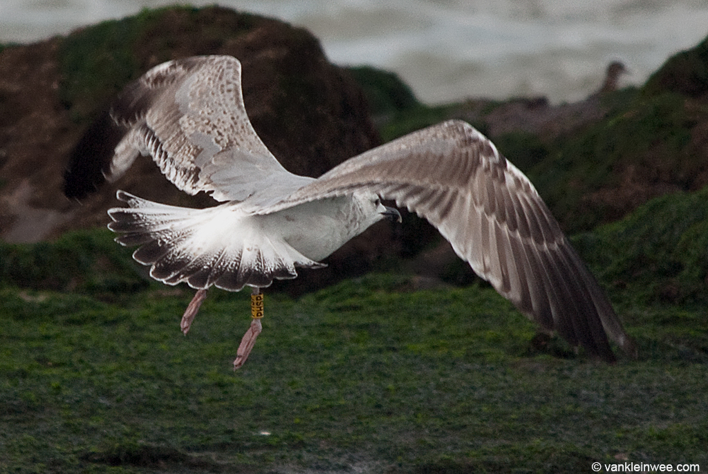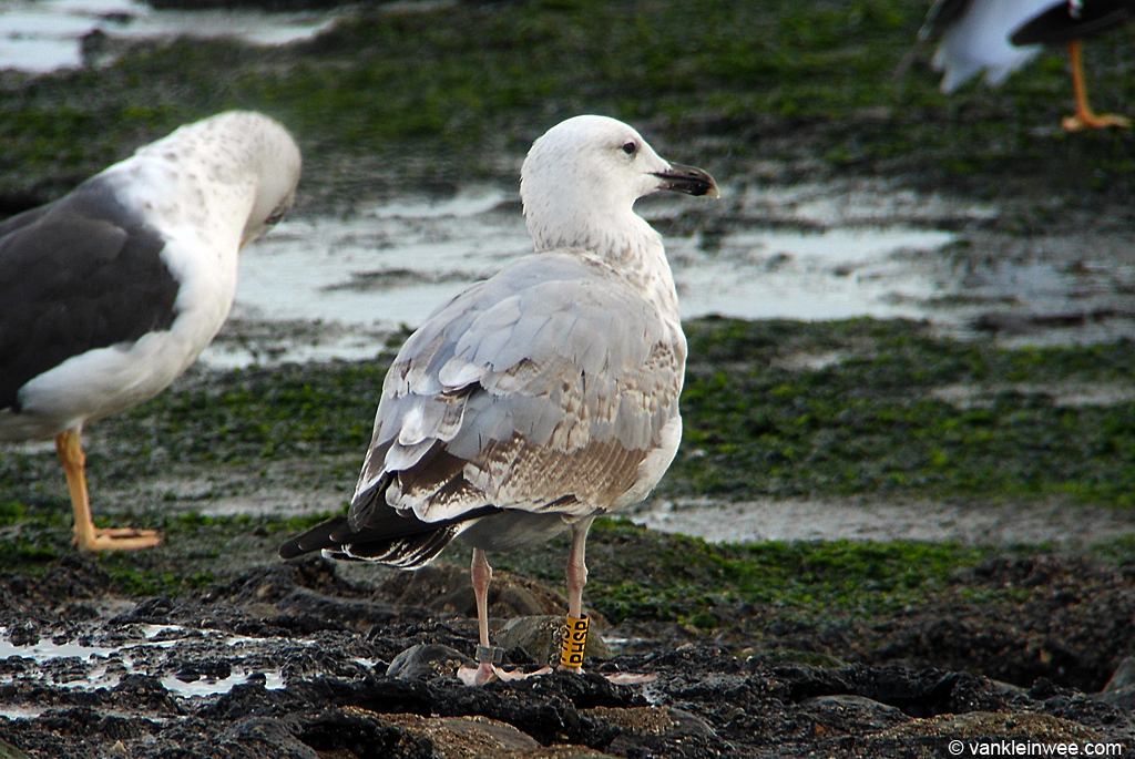 Larus cachinnans 2CY PHSP October 04 2012, Westkapelle, the Netherlands. Picture: Maarten van Kleinwee. Yellow PHSP and metal PLG DN-27551; ringed as pullus on May 28 2011, at Kozielno Paczkow Opolskie, Poland (50,476598 16,98173). Note the faint hint of a mirror on P10. |