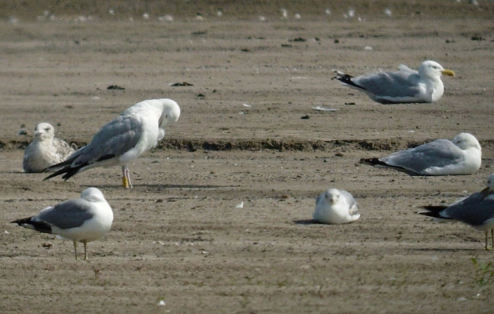 In this area are mixed breeding colonies (near Katowice), with far most birds breeding here are cachinnans, but in this area also records of very few michahellis from the south (e.g. ringed female from Italy) and argentatus from eastern Germany are possible (see PDF). PKAK is classic cachinnans. below: cachinnans 2CY PKAK January 06 2012, Deponie Pohlsche Heide - Minden, Germany (52°23'05N, 08°46'45E). Picture: Armin Deutsch. First image: together with two 1st winter Herring Gulls. Last acquired lower scapulars are almost completely greyish, just with a dark shaft streak. below: cachinnans 3CY PKAK July 08 2013, Schinna, Germany (52°32'05N, 09°05'52E). Picture: Armin Deutsch. Moulting in very adult-like grey plumage. |