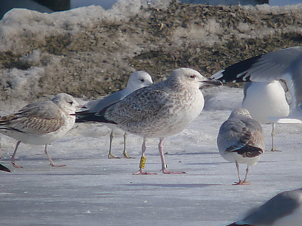 Larus cachinnans 2CY PKDE February 2012, Switzerland. Picture: Ernst Weiss. Yellow PKDE and metal PLG DN-27691; ringed as pullus on May 26 2011 at Kozielno, Paczkow, S-SW Poland, (50°29' N, 16°58' E). Checkered covert pattern, reminiscent of Herring Gull and very barred 2nd gen scapulars. |