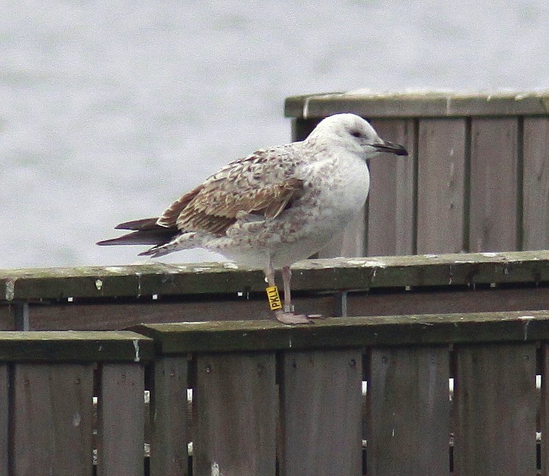 Larus cachinnans 2CY PKLL January 20 2013, Best, the Netherlands. Picture: Antonio Mendoza. Yellow PKLL and metal PLG DN-28652, ringed as pullus on May 25 2012, at Kozielno, Paczkow, S-SW Poland, (50°28' N, 16°58' E). Most coverts and tertials still juvenile, just a few LC replaced. |