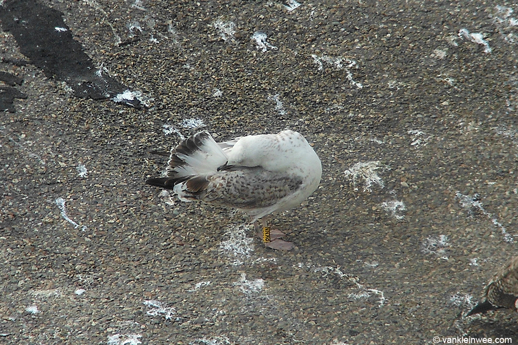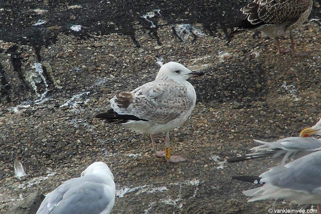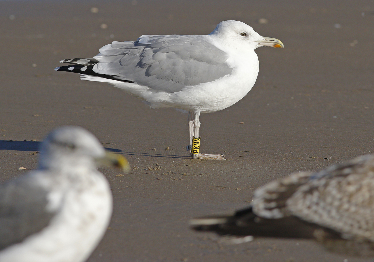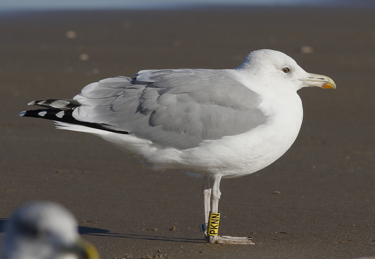 Larus cachinnans PKNN 2CY & 5CY, September 2013 & October 2016, Katwijk, the Netherlands. Picture: Maarten van Kleinwee & Mars Muusse. Yellow PKNN and metal PLG DN-28669, ringed as pullus on May 25 2012, at Kozielno, Paczkow, S-SW Poland, (50°28' N, 16°58' E). below: Larus cachinnans PKNN 5CY, October 05 2016, Katwijk, the Netherlands. Picture: Mars Muusse. P9-P10 growing.