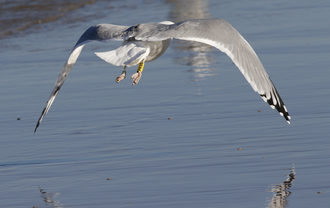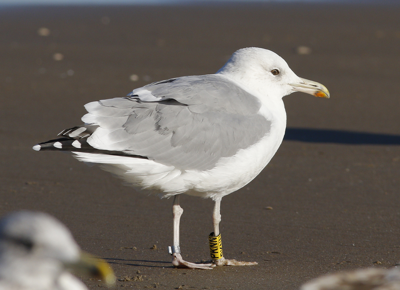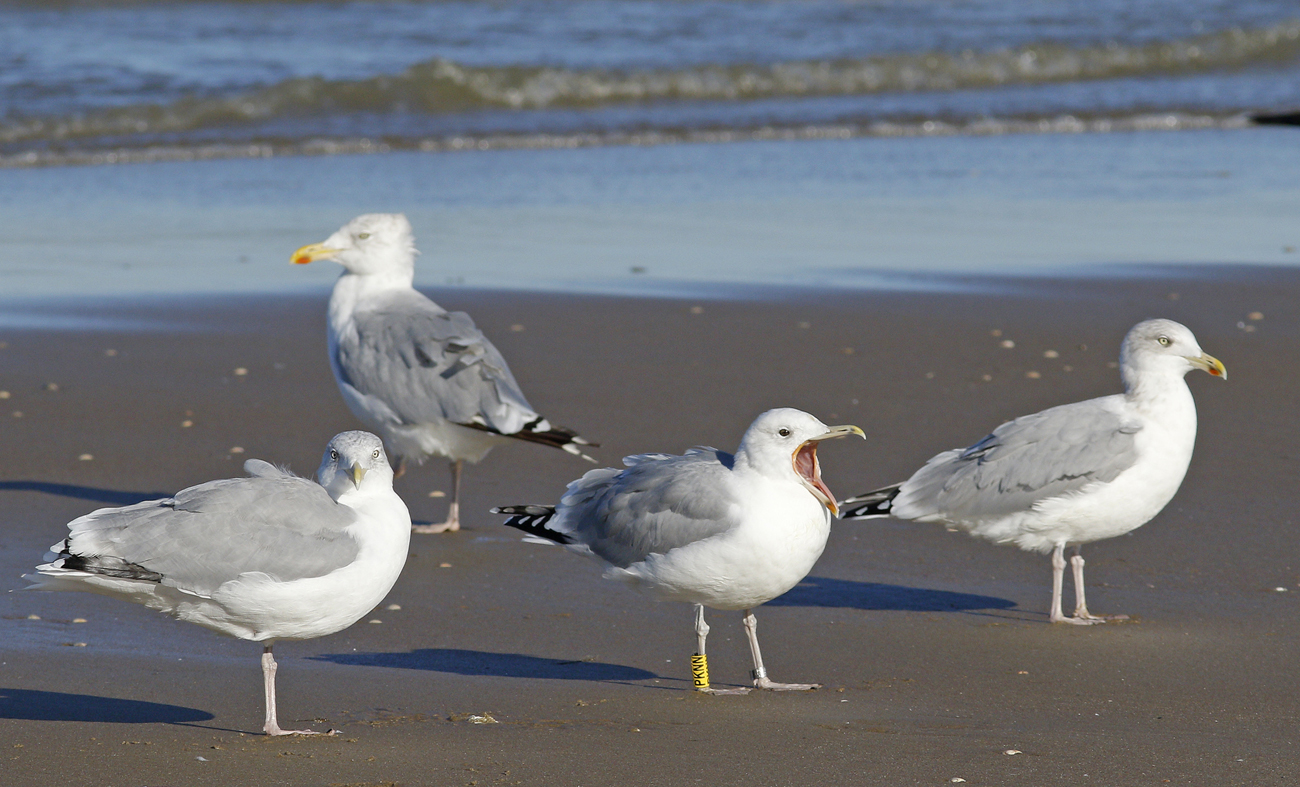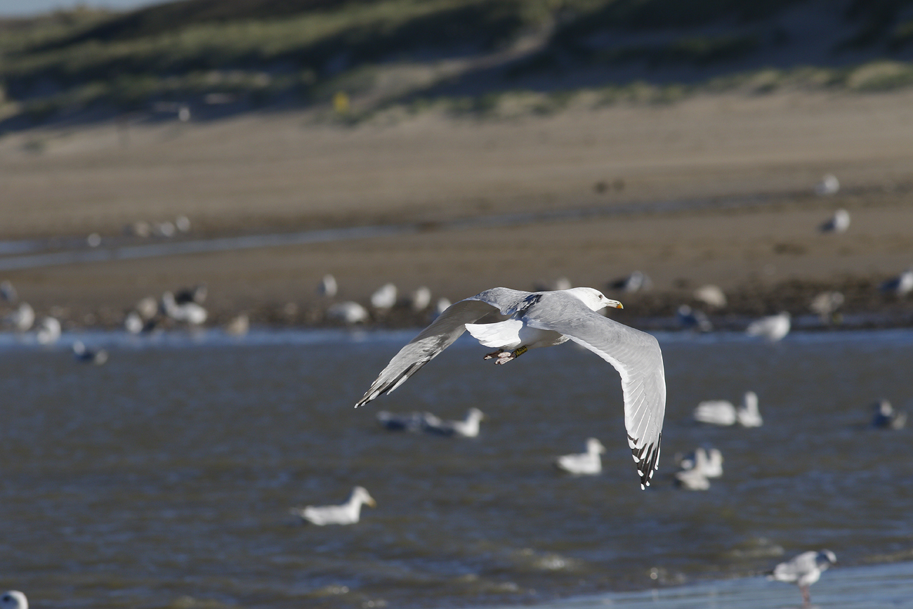Larus cachinnans PKNN 2CY & 5CY, September 2013 & October 2016, Katwijk, the Netherlands. Picture: Maarten van Kleinwee & Mars Muusse. Yellow PKNN and metal PLG DN-28669, ringed as pullus on May 25 2012, at Kozielno, Paczkow, S-SW Poland, (50°28' N, 16°58' E). below: Larus cachinnans PKNN 5CY, October 05 2016, Katwijk, the Netherlands. Picture: Mars Muusse. P9-P10 growing.