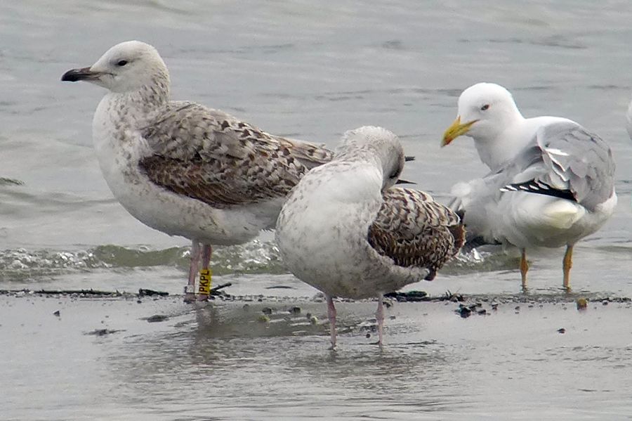 Larus cachinnans 2CY PKPL February 11 2013, Lake of Constance - Steinach, Switzerland. Picture: Stephan Trösch. Yellow PKPL, ringed as pullus on May 25 2012 at Kozielno Paczkow Opolskie, Poland (50,48333N 16,96667E). Upper tertials and inner coverts replaced in post-juvenile moult. |