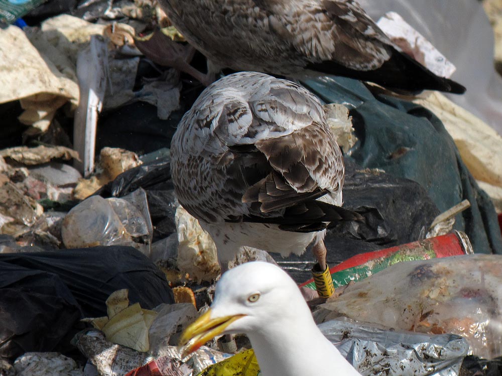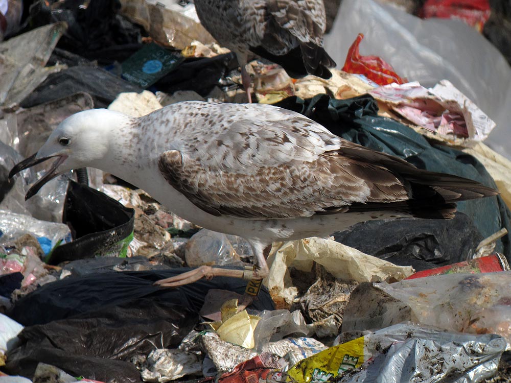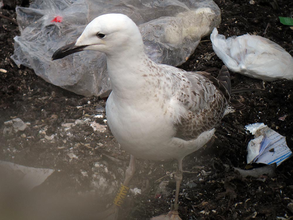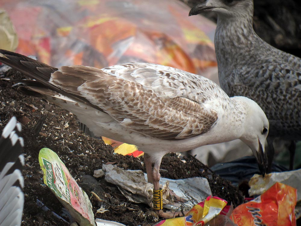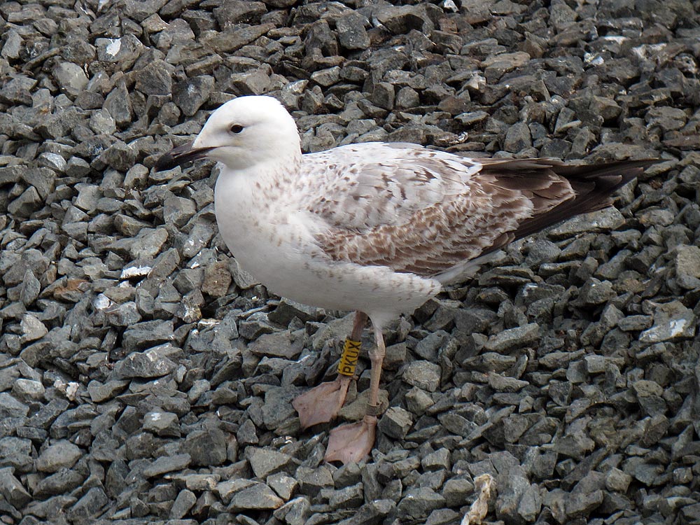 Larus cachinnans 2CY PKUX March 14 2013, CET La Séguinière, France. Picture: Alain Fossé. Yellow PKUX and metal PLG DN-28744; ringed as pullus on May 25 2012 at Kozielno, Paczkow, S-SW Poland, (50°28' N, 16°58' E). No coverts & no tertials replaced. Snowy white underparts.