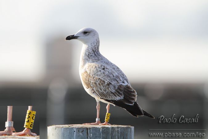 Larus cachinnans 2CY PLCL February 2013, Switzerland. Picture: Paolo Casali. Yellow PLCL, ringed as pullus on May 25 2012 at Kozielno, Paczkow, S-SW Poland, (50°28' N, 16°58' E). No tertials but several inner coverts replaced in post-juvenile moult. Note simple pattern on recent replaced scapulars. |