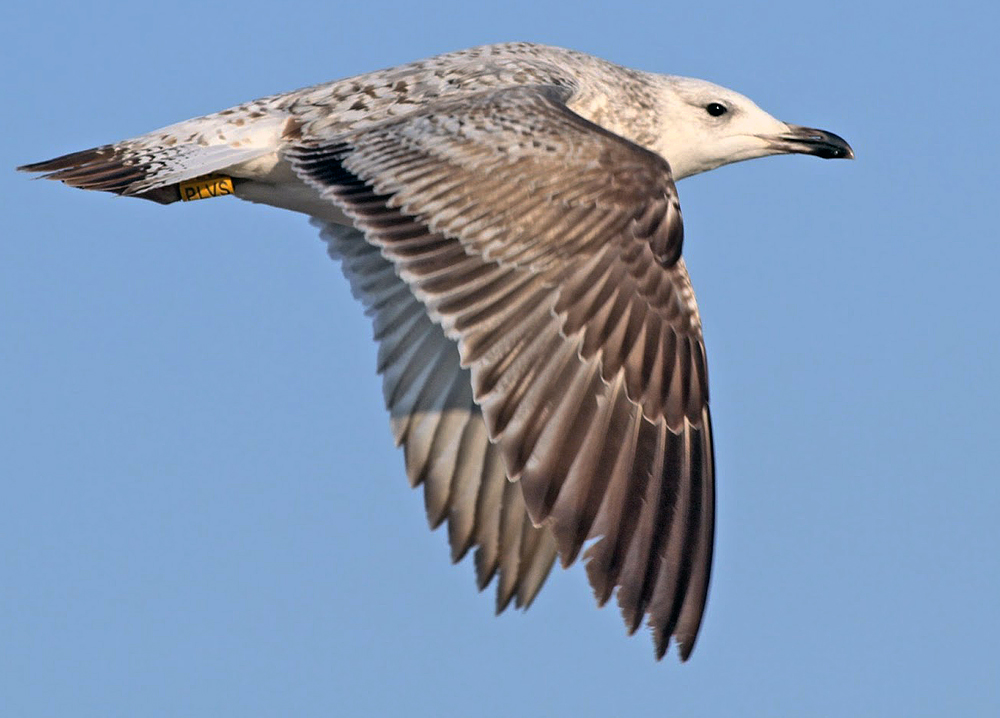 Larus cachinnans 2CY PLVS March 04 2013, Jakuševec-Zagreb, Croatia. Picture: ringing team Luka Jurinovic. Ringed yellow PLVS, ringed as pullus on May 29 2012 at Jankowice Babice Malopolskie, Poland. Several inner coverts replaced in post-juvenile moult. Relatively clean outerwebs of outer rectrices. |