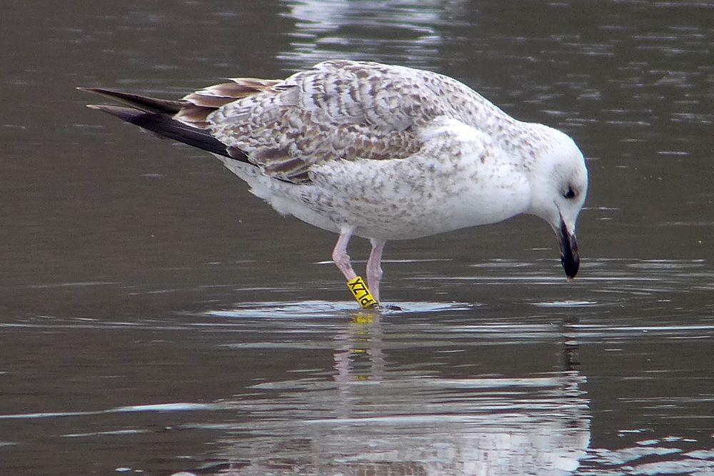 Larus cachinnans 2CY PLZX February 11 2013, Lake of Constance - Altenrhein, Switzerland. Picture: Stephan Trösch. Yellow PLZX, ringed as pullus on May 29 2012 at Jankowice Babice Malopolskie, Poland (50,03333N 19,46667E). No tertials but several inner coverts replaced in post-juvenile moult. |