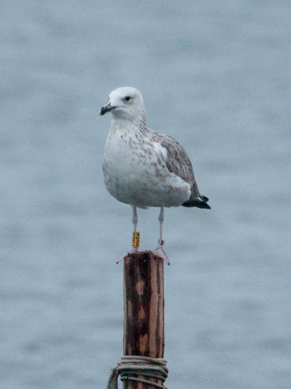 Larus cachinnans 2CY PNEK April & August 2014, Belgium & the Netherlands. Picture: Maurice Segers & Eric Roeland. Bird ringed yellow PNEK, ringed as pullus on May 24 2013 at Kozielno, Paczkow, S-SW Poland, (50°28' N, 16°58' E). Larus cachinnans 2CY PNEK August 07 2014, Oostvaardersdijk, Almere, the Netherlands. Picture: Eric Roeland. Last phase of complete moult. Larus cachinnans 2CY PNEK April 19 2014, Bruxelles, Belgium. Picture: Maurice Segers. First phase of complete moult: P1-P3 missing.