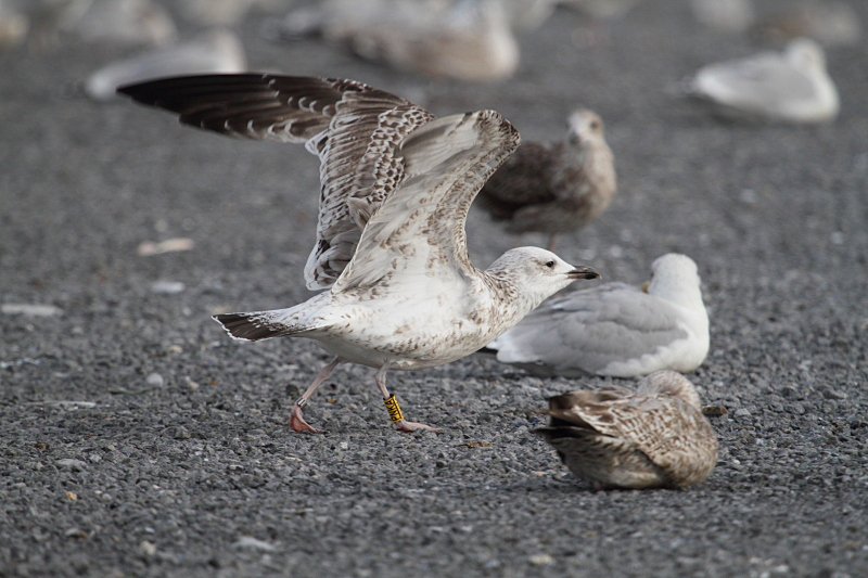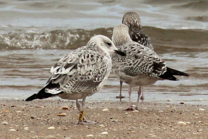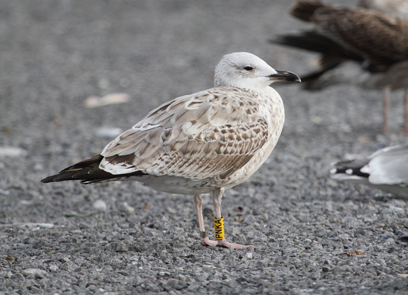 Larus cachinnans 2CY PNKA September-October 2014, France-Belgium. Picture: Laurent Houssier & Peter Adriaens. Bird ringed yellow PNKA, ringed as pullus on May 24 2013 at Kozielno, Paczkow, S-SW Poland, (50°28' N, 16°58' E). Larus cachinnans 2CY PNKA October 17 2014, Oostende, Belgium. Picture: Peter Adriaens. Partial moult almost finished. Still growing TT3.