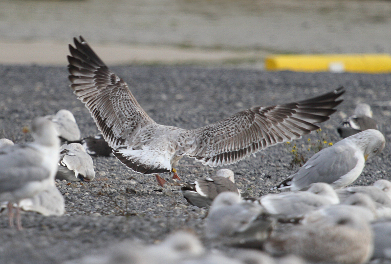 Larus cachinnans 2CY PNKA September 19 2014, Houlgate - Calvados, France. Picture: Laurent Houssier. By September the partial moult is started, with growing fresh central median coverts. |