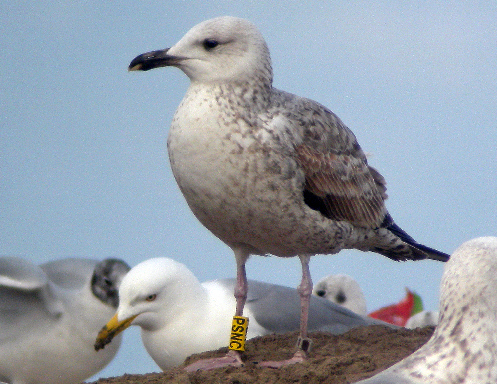 Larus cachinnans 2CY PSNC February 19 2012, Zagreb, Croatia. Picture: Ruud Altenburg. Bird ringed yellow PSNC & metal UKK L-011035, ringed as pullus on June 10 2011 at Cherkasy Kreminchuk reservoir Ukraine (49,401 32,15). Post-juvenile moult included at least some central MC, central LLC, and several of the LC. Exact moult hard to see from this angle. |