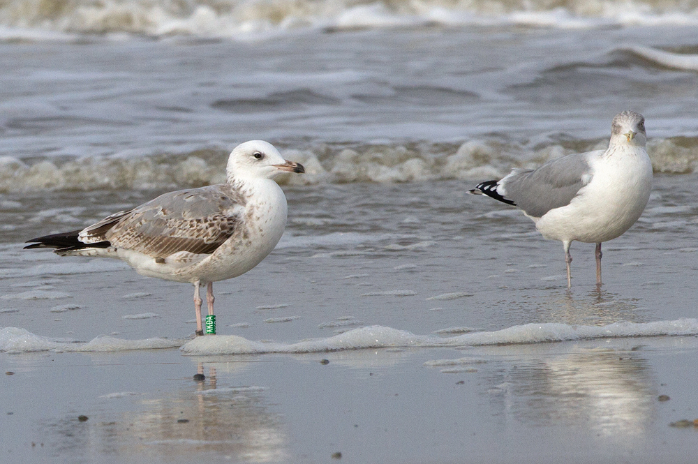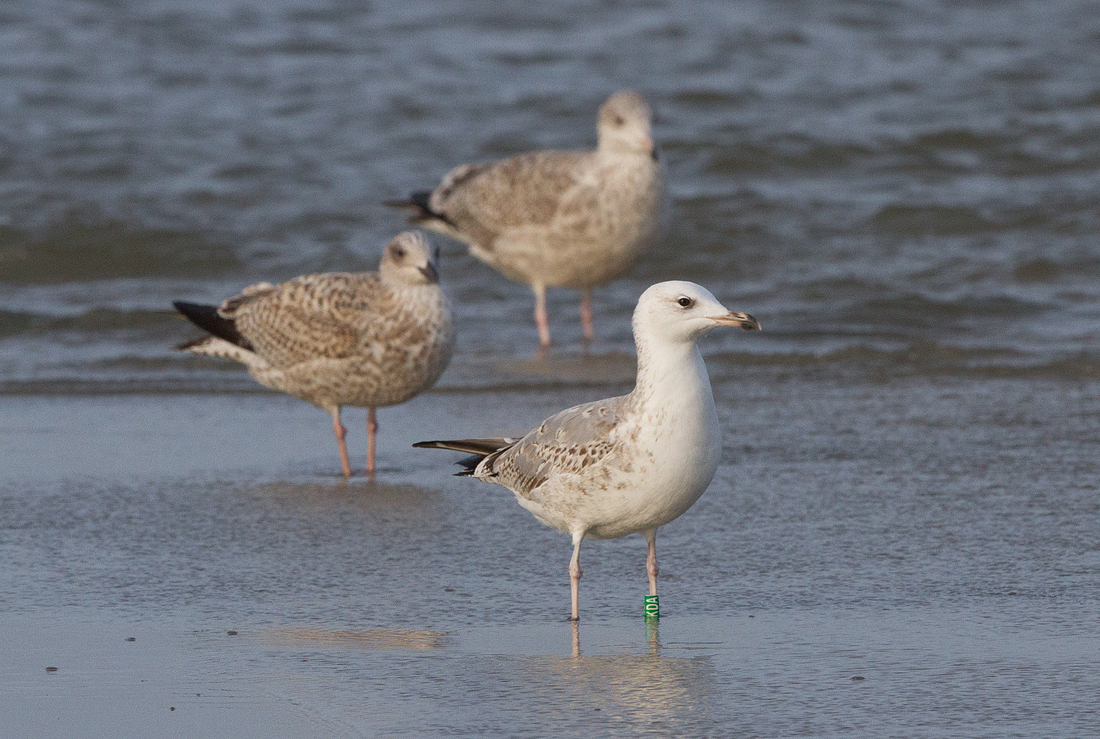 Larus cachinnans 1CY-2CY XKDA December 20 2013, Scheveningen & November 18 2014, Terschelling, the Netherlands. Green XKDA and metal DEH EA-183789, ringed as pullus on June 07 2013 at Gräbendorfer See, Brandenburg, Germany (51°42'00"N 014°06'00"E). Recoveries: below: Larus cachinnans 2CY XKDA November 18 2014, Terschelling, the Netherlands. Picture: Jacob Jan de Vries. This is a bird from a mixed colony with breeding cachinnans, argentatus and michahellis. This bird, green XKDA in line with pure cachinnans: white head, covert pattern after partial autumn moult, bill. Also note mirror on 2nd gen P10, commonly found in cachinnans.