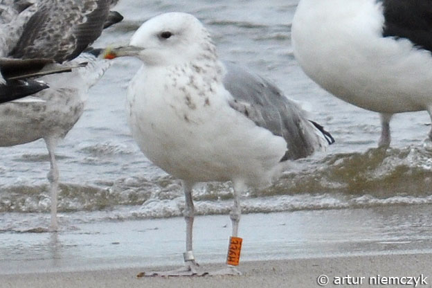 Larus cachinnans 3CY 336H August 30 2011, Krynica Morska, Poland. Picture: Artur Niemczyk. Orange 336H, ringed at Jakuševec-Zagreb landfill, probably November 2011. Outer primaries still growing, note large white tips on fully grown primaries. |