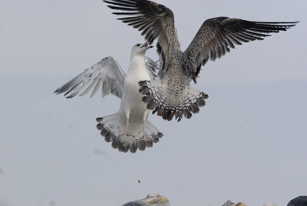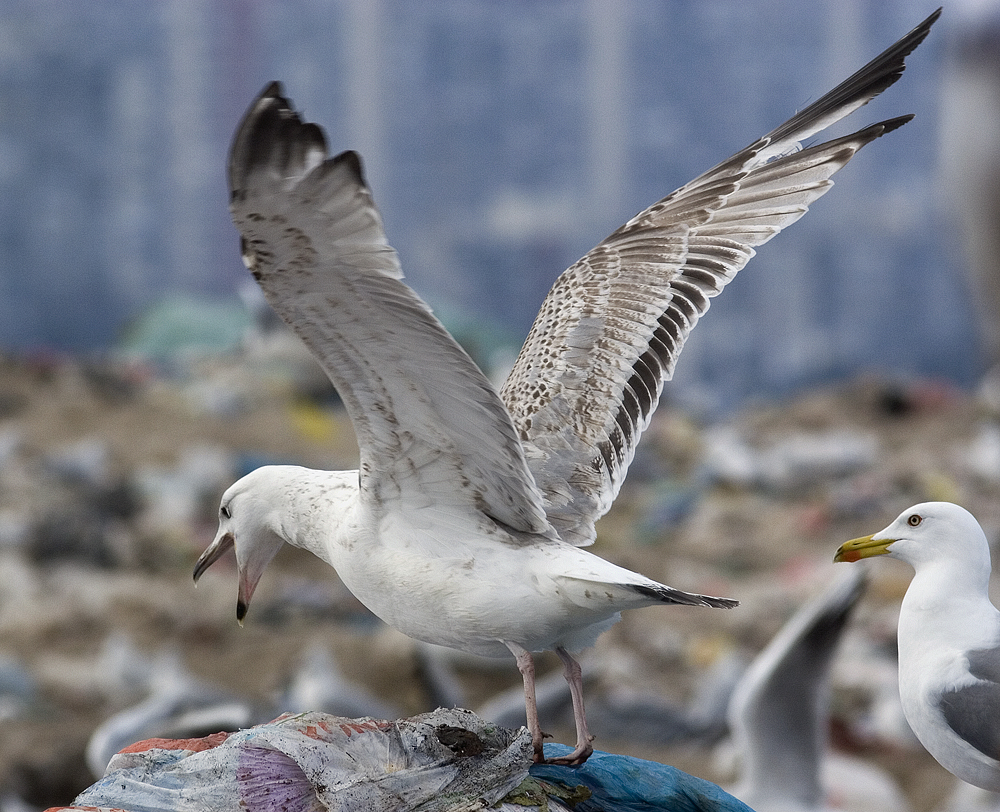 Larus cachinnans 3cy, 19 February 2012, Zagreb, Croatia. Picture: Mars Muusse. Fight with 2cy Caspian Gull. Hint of a mirror on P9 and P10. See also HERE. Note grey MC, replaced again in partial autumn moult last year. |