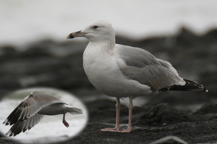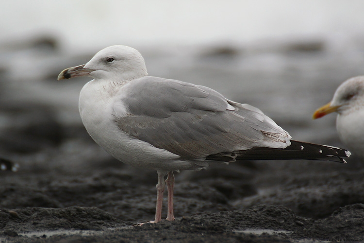 Larus cachinnans 3cy, November 10 2008, Westkapelle, the Netherlands. Picture: Ies Meulmeester. Note the heavy and bulky build and the relatively pale whitish iris in this 3cy Caspian Gull. The following features are good points to allow identification of this plumage as being 3cy: the pinkish colored bill with a black subterminal band on the gonys, the indistinct and unsharp cutting edges of the black on the primaries, the immature brown/blackish patterns and markings in the wing-coverts and tertials, small white primary tips, some dark markings in the tail, a large and broad mirror on P10 (but admittedly with a solid black subterminal band between the mirror and the white primary tip) and also a rounded mirror on P9. |