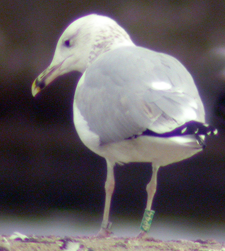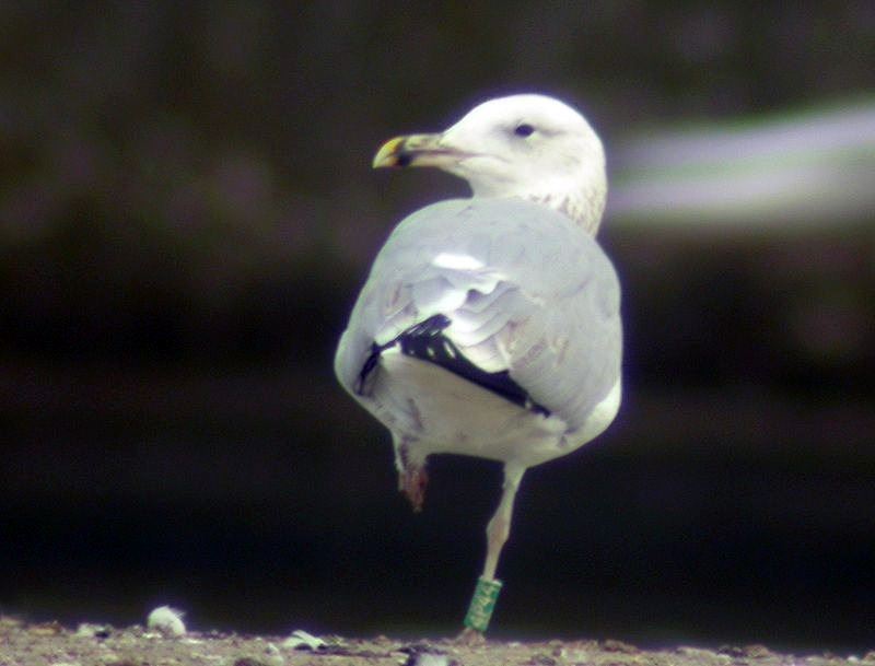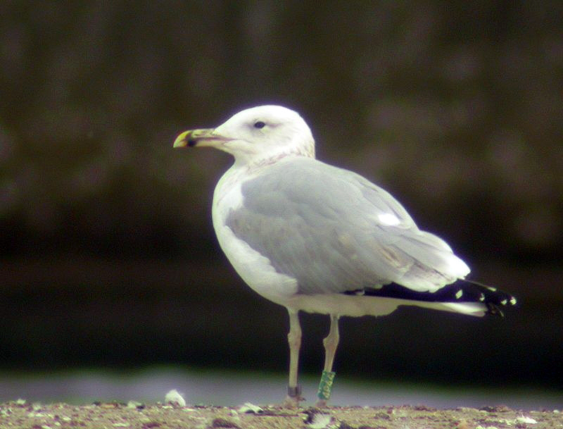 Larus cachinnans 3CY 4P44 October 25 2006, Mur de Lixhe, Belgium. Picture: Charly Farinelle. Green 4P44 and metal DN16475. Bird ringed as pullus on May 09 2004 at Wisla Wloclawek Tama, Poland. Note immature patterns on lower tertials and on several greater coverts. Also much black on the bill and relatively small white tips to primaries. Dark iris.