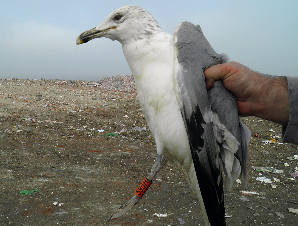 Larus cachinnans 3CY 595H November 25 2012, Jakuševec-Zagreb, Croatia. Picture: ringing team Luka Jurinovic. Orange 595H, ringed at Zagreb landfill. Difficult bird, probably cachinnans but michahellis hard to exclude. Note especially 3rd gen outer primaries, with deep pale tongues on P7-P9 and with a large mirror already on P10 and a long white tongue on P10. There is still a full subterminal band on P10, but immature birds normally have much more black than full adults do.