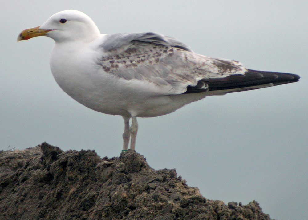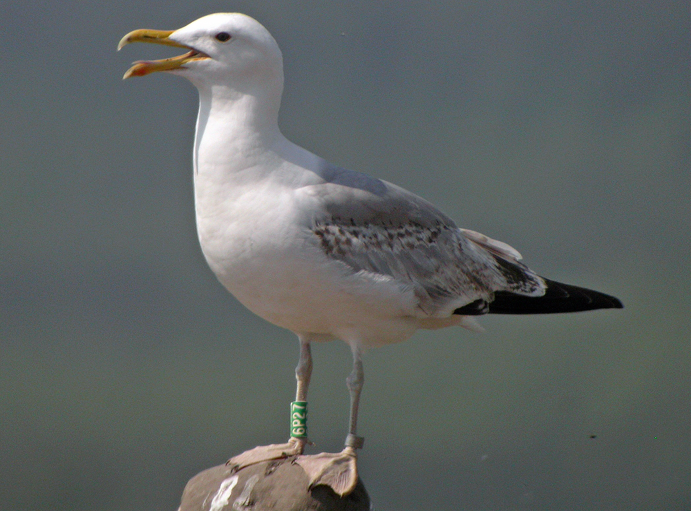 Larus cachinnans hybrid? 4CY 6P27 May 17 2007, Łubna landfill, Poland. Picture: Ruud Altenburg. Green 6P27. Ringed as a pullus on May 13 2004 in the mixed colony of Wisla reservoir - Wloclawek, Poland (52°39'N, 19°08'E). This bird is a good example of the problem ageing sub-adult Caspian Gulls. There is a large proportion of 'immature' wing coverts and a white mirror on P10 seems to be absent altogether. Still green 6P27 is 4cy, ringed as pullus at Włocławek, known for its mixed breeding population (pulli registered as "Larus argentatus-complex"). The presence of so many immature patterned wing-coverts and tertials may be an indication for argentatus geneflow - normally Caspian Gull develop a mature plumage earlier that Herring Gulls do.