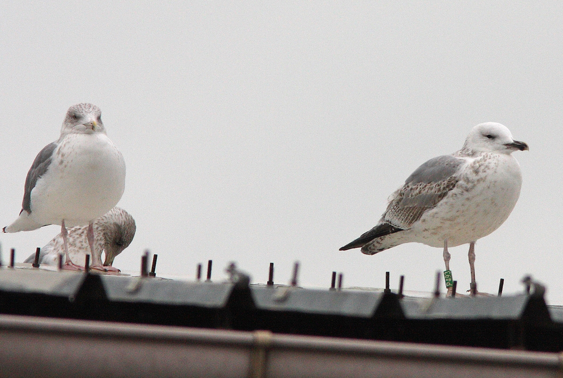 Larus cachinnans 3CY P493 January 04 2014, Boulogne-sur-Mer, France. Picture: Jean-Michel Sauvage. Green P493, ringed as pullus on May 27 2012 at Urszulin, Poland. History: Classic, in showing grey scapular saddle and replaced grey median coverts. White underparts and head with streaking concentrated in hindneck ('boa'). |