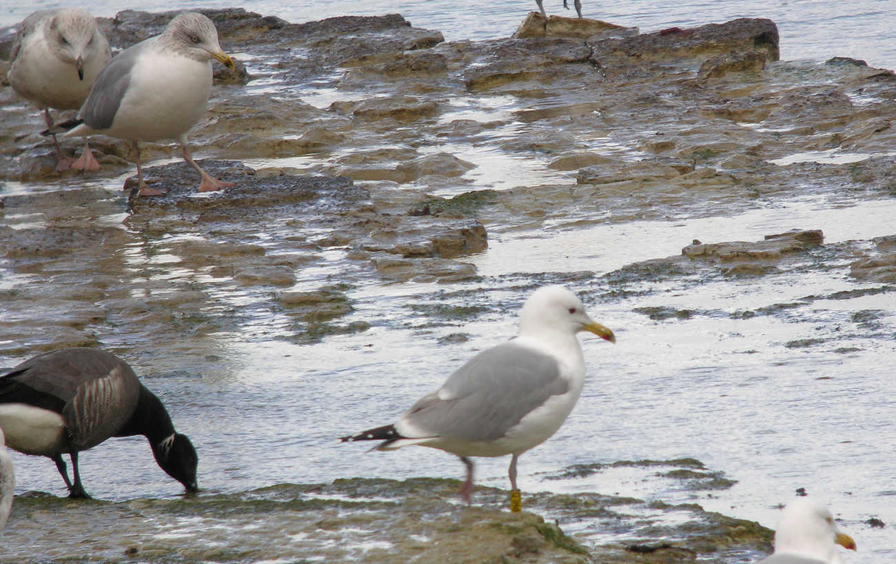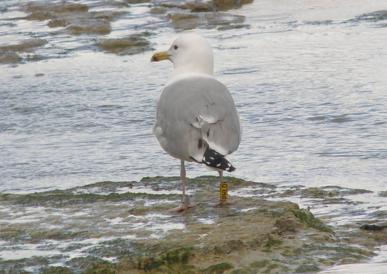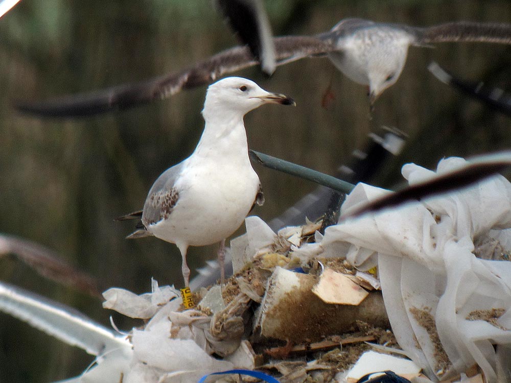 Larus cachinnans PHLD 3CY-4CY, March - July 2013 & March 2014, CET Champteussé-sur-Baconne, France. Picture: Alain Fossé & Olivier Laluque. Yellow PHLD, ringed as pullus on May 26 2011, at Kozielno Paczkow Opolskie Poland (50,48333 16,96667). below: cachinnans PHLD 4CY, March 23 2014, "La Morelière" - Saint-Denis-d'Oléron (17), France (N 46°02'39.4" W 001°23'49.6"). Picture: Olivier Laluque. Black spots on tertials, and greater primary coverts.
