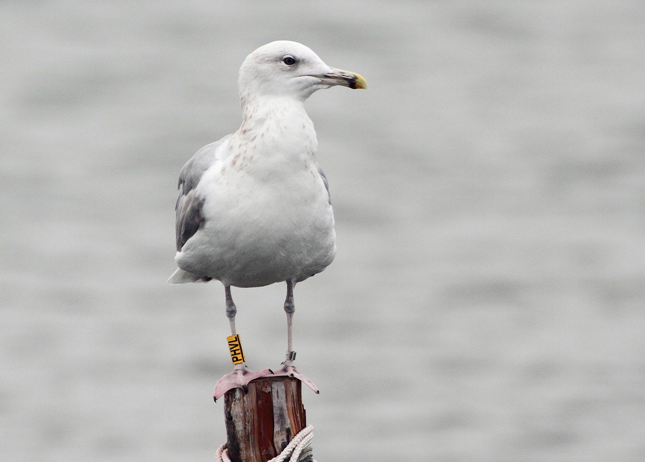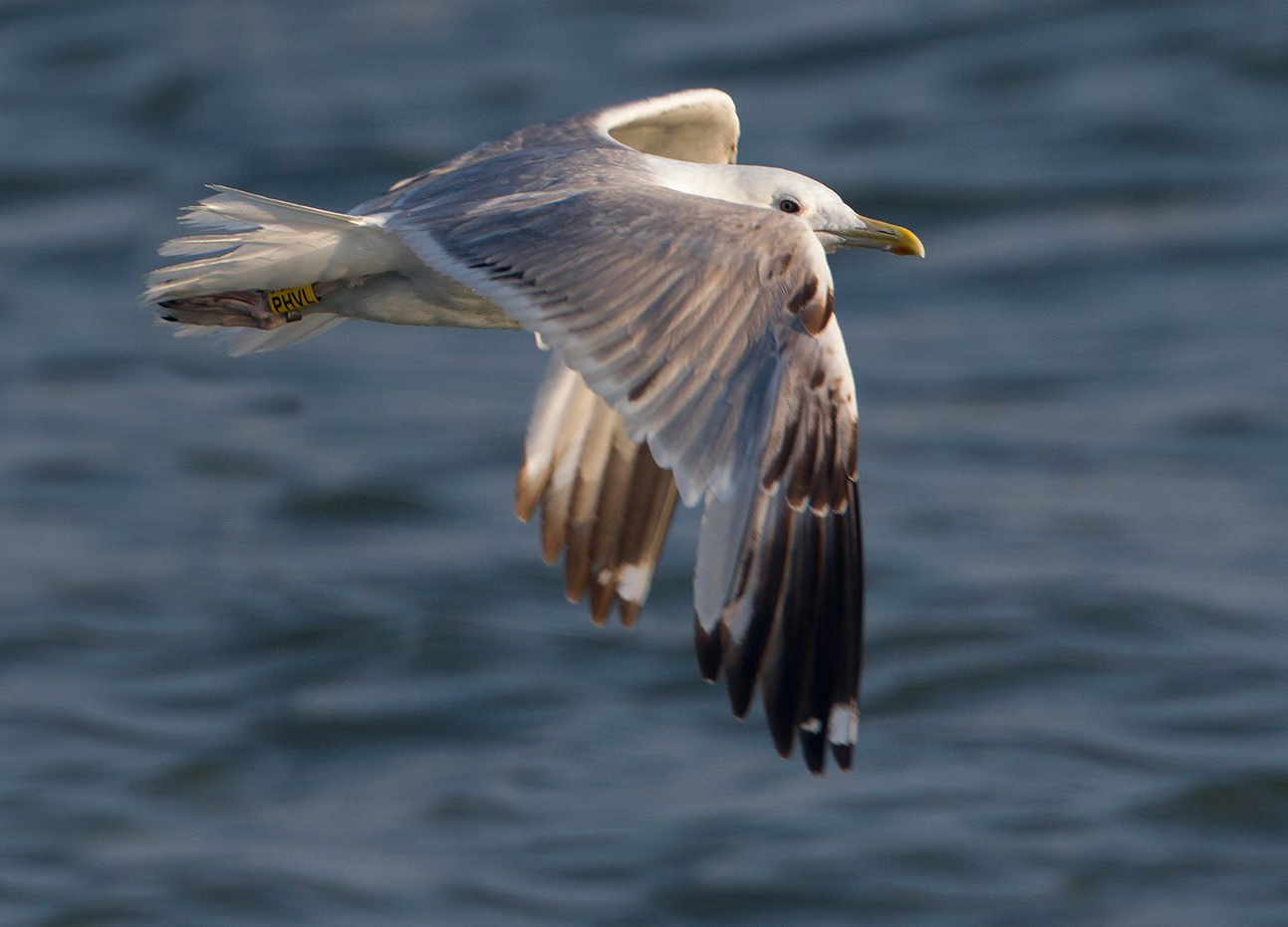 Larus cachinnans PHVL 3CY-4CY, October 2013 - July 2014, Almere, the Netherlands. Picture: Karel Mauer & Eric Roeland. Yellow PHVL; ringed as pullus on May 26 2011, at Kozielno Paczkow Opolskie, Poland (50,476598 16,98173). below: Larus cachinnans PHVL 4CY, July 18 2014, Almere, the Netherlands. Picture: Karel Mauer. Bird in complete moult: P1-P2 replaced, P3 growing, P4-P5 missing, P6-P10 old 3rd generation. Mirrors on both P9 and P10. Adult-like secondaries with dark centres. Single very small spots in tail. Brown centres on greater primary coverts. Bill not really saturated, but already no black. Slightly paler iris.